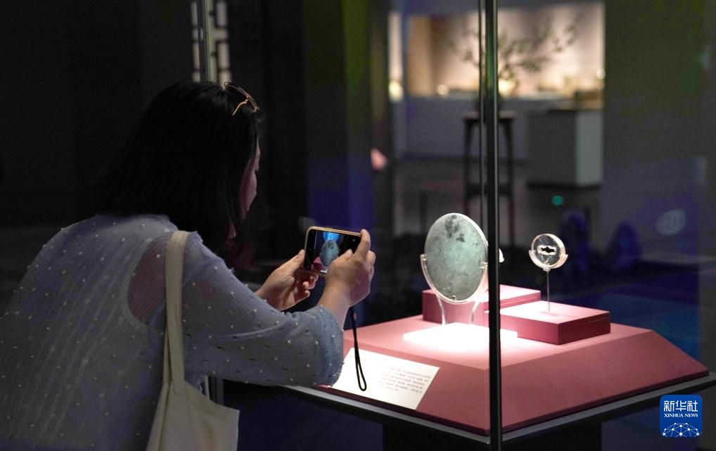 8月13日,媒体人员在拍摄海兽葡萄纹铜镜。新华社