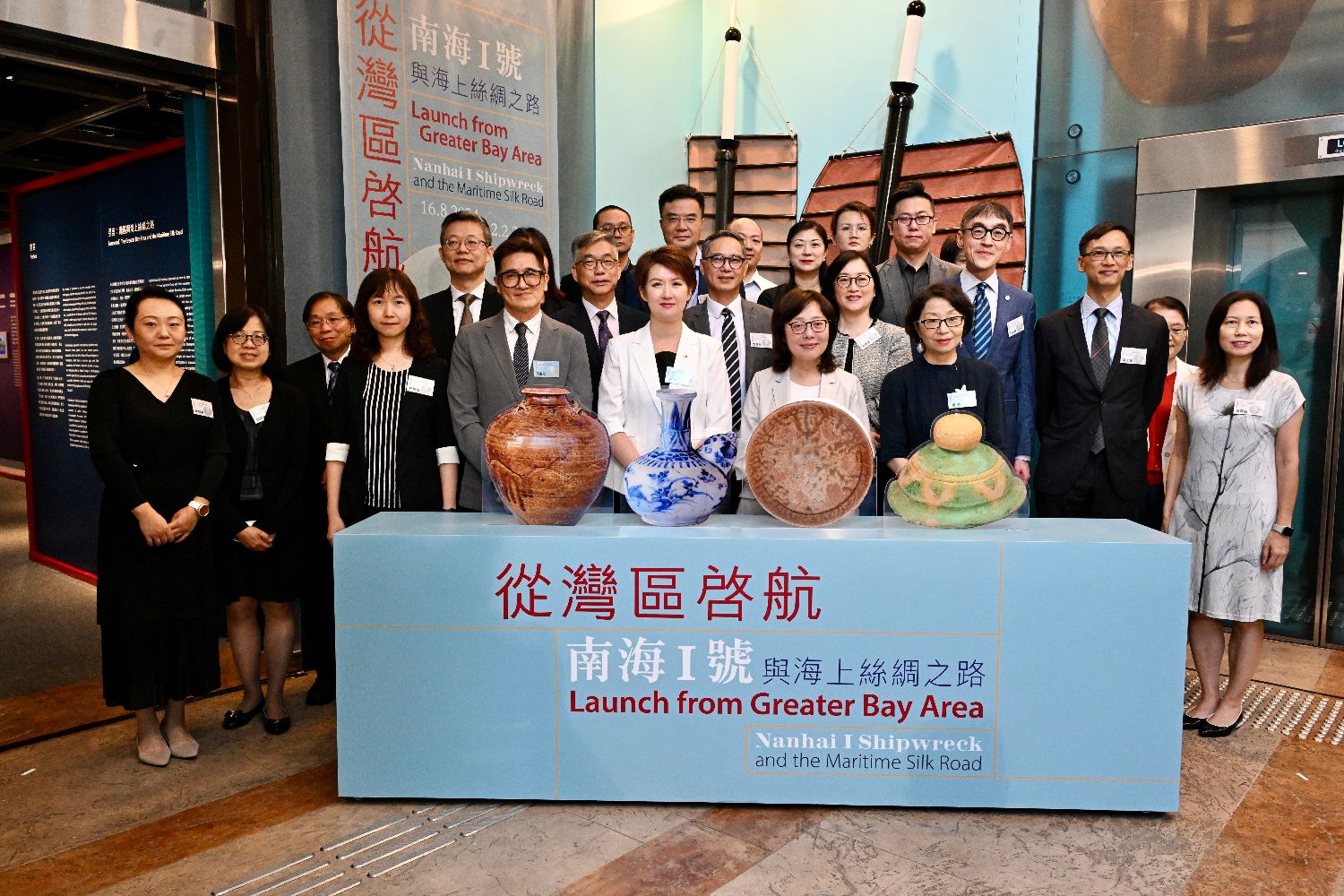 8月15日,由中国国家文物局、香港特区政府发展局、澳门特区政府社会文化司合办的“从湾区启航:‘南海I号’与海上丝绸之路”展览在香港文物探知馆举行开幕礼及传媒预览。展览展出255项展品,包括“南海I号”的出土文物及粤港澳三地的相关文物,以展示粤港澳大湾区在海上丝绸之路的角色。“南海I号”是南宋时期的商舶,在广东往南海的航道上沉没,至2007年被打捞出水,是迄今考古发现保存最完整的古代远洋商船。图为嘉宾出席活动开幕礼。中新社