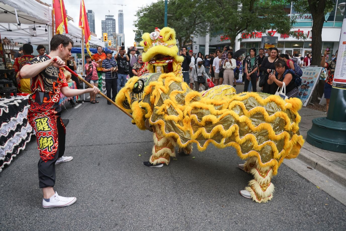 由加拿大多伦多中区华埠商业促进区主办、一年一度的同乐日已成为多伦多唐人街的品牌活动之一。今年同乐日主题为“龙行天下绽放异彩”。图为当地时间8月17日,在第24届多伦多中区华埠同乐日活动中,醒狮采青表演吸引游人驻足。中新社