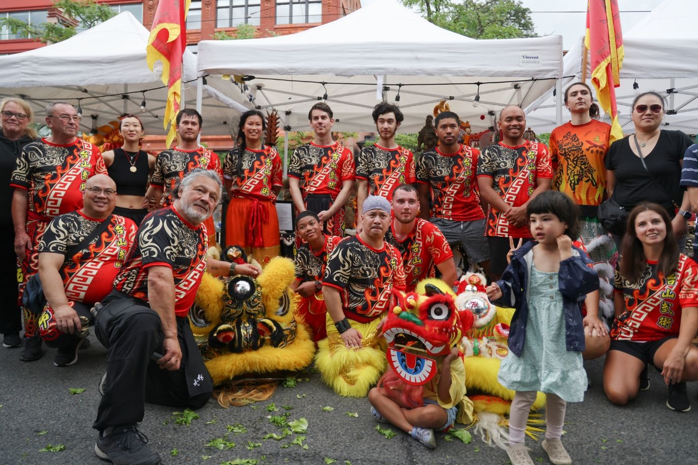 当地时间8月17日,在加拿大多伦多,在第24届多伦多中区华埠同乐日活动中,一间武馆的醒狮队师徒们与游客合影。中新社