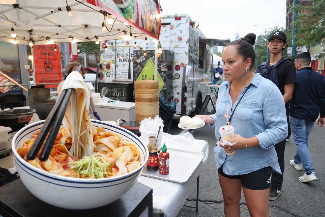 当地时间8月17日,在第24届多伦多中区华埠同乐日活动中,美食区一处摊档前的凉皮模型吸引食客目光。中新社