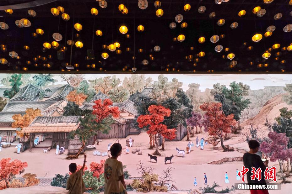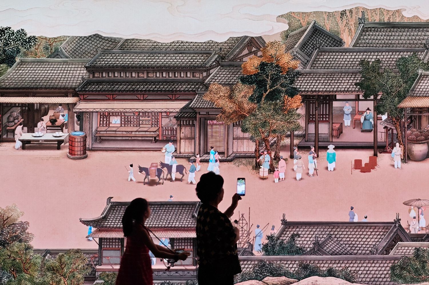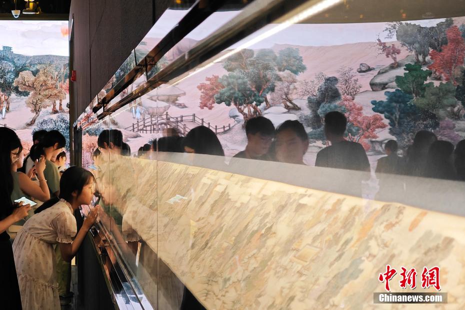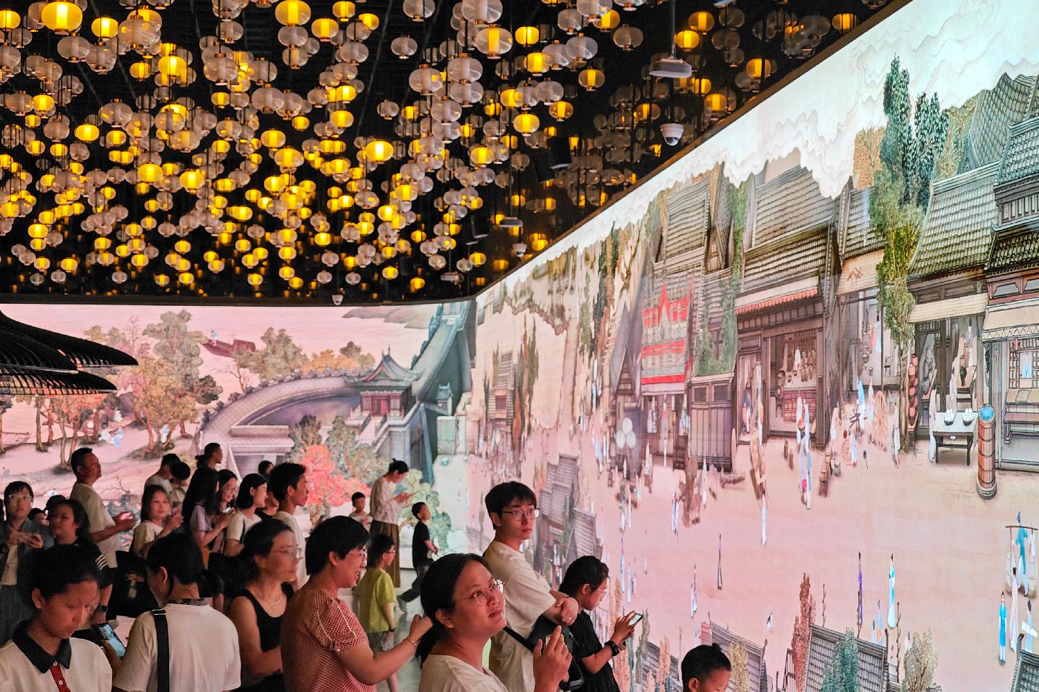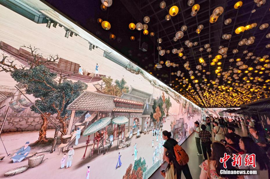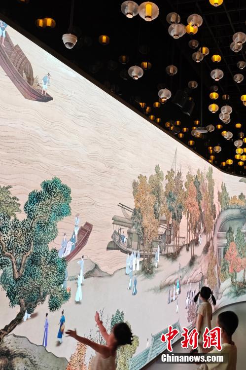 在江苏南京德基艺术博物馆举办的“金陵图数字艺术展”,将新锐科技引入清代画家冯宁所作的《仿杨大章画<宋院本金陵图>》中,在全长近110米的屏幕上生动呈现“人物入画,实时跟随”的互动观展模式。观众通过手机与数字展览互动,融入画面角色,在移步换景间仿佛置身于古代南京的街市,感受历史文化与民间风俗。图为8月19日,江苏南京,观众在德基艺术博物馆内欣赏“金陵图数字艺术展”。中新社