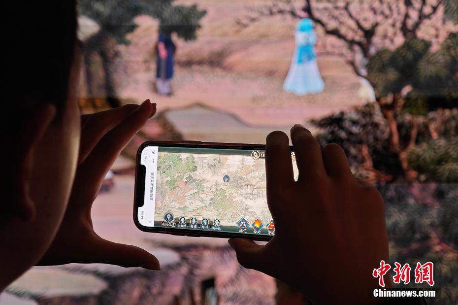 8月19日,观众通过手机与德基艺术博物馆“金陵图数字艺术展”互动,融入画面角色。中新社