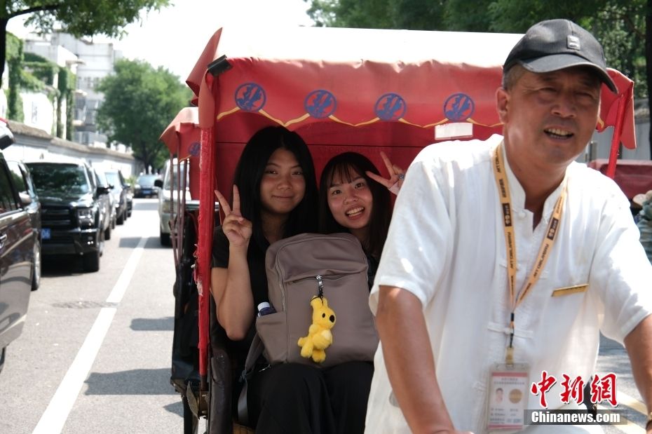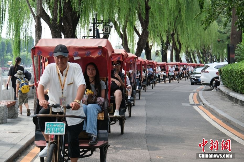 8月18日,参加2024年台湾大学生网信企业实习活动的同学们坐“三轮车”,逛胡同,感受北京文化。图为台湾大学生坐“三轮车”参观什刹海。