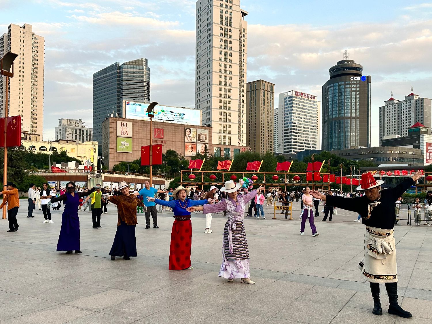 在青海省每年最具生机活力的8月,海外华文媒体代表8月23日起相聚“大美青海”,参加“2024年海外华文媒体青海采访活动”,通过实地采访和联谊交流感受青海的自然与人文。图为傍晚时分,在西宁市中心购物广场,市民们跳起藏舞广场舞。毛伯贤/摄