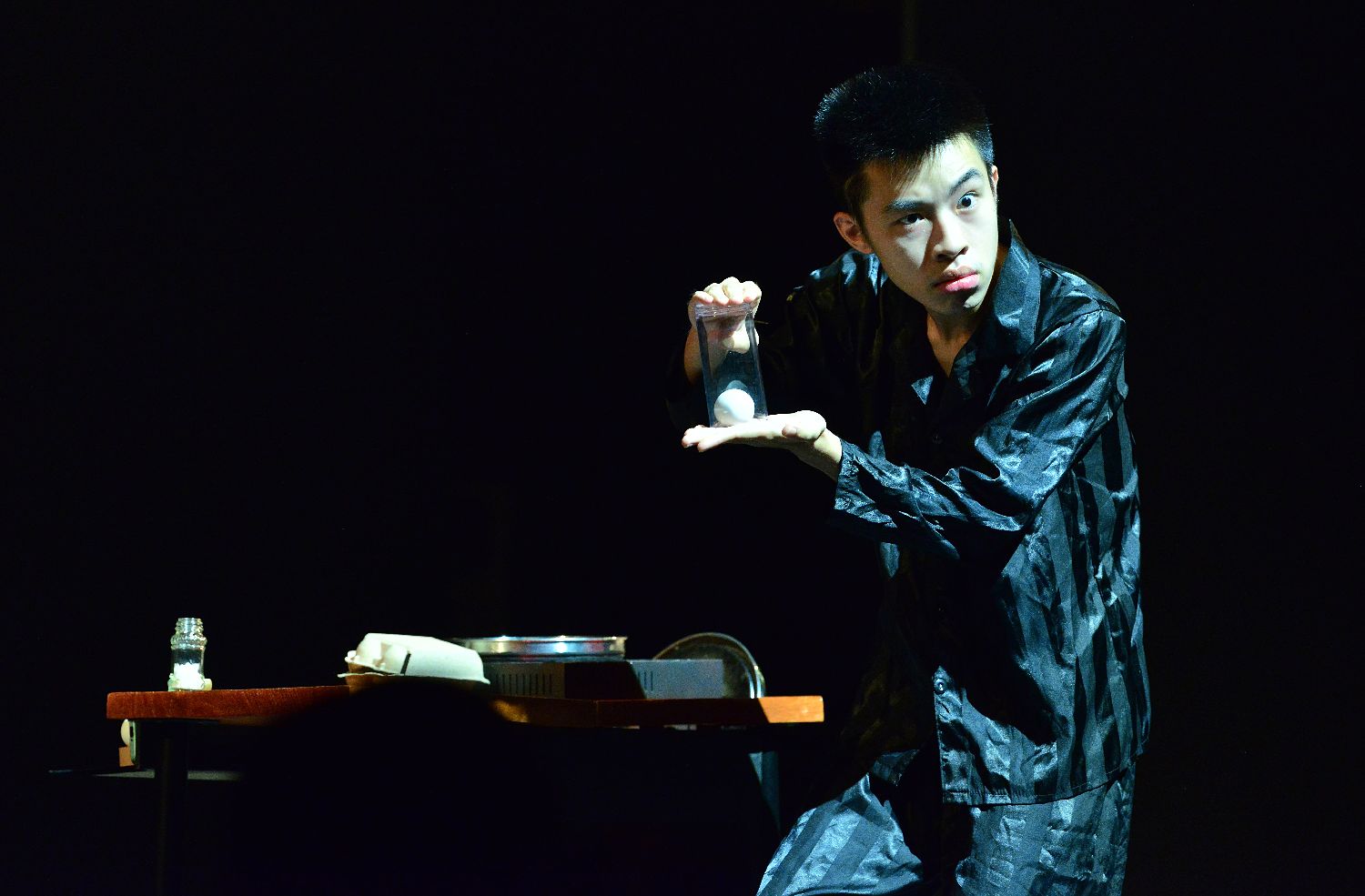 8月26日晚,以“魔幻青春海峡圆梦”为主题的第六届闽台大学生魔术交流大会闽台大学生优秀魔术节目展演在福建省福州市举行,来自两岸的大学生魔术师同台竞技,为观众呈现了一场精彩的魔幻盛宴。图为来自台湾彰化师范大学的余嘉恩表演节目《敲不破的蛋》。中新社