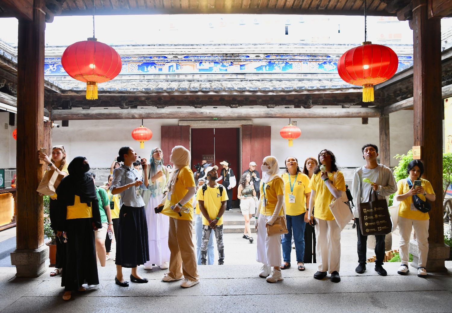 第二十三届“汉语桥”世界大学生中文比赛全球决赛启动仪式近日在福建南平举行。本次比赛包含赛事比拼和文化体验,吸引来自全球130个国家和地区的147名选手参加。图为8月28日,“汉语桥”参赛外国大学生在三坊七巷参观古厝。中新社