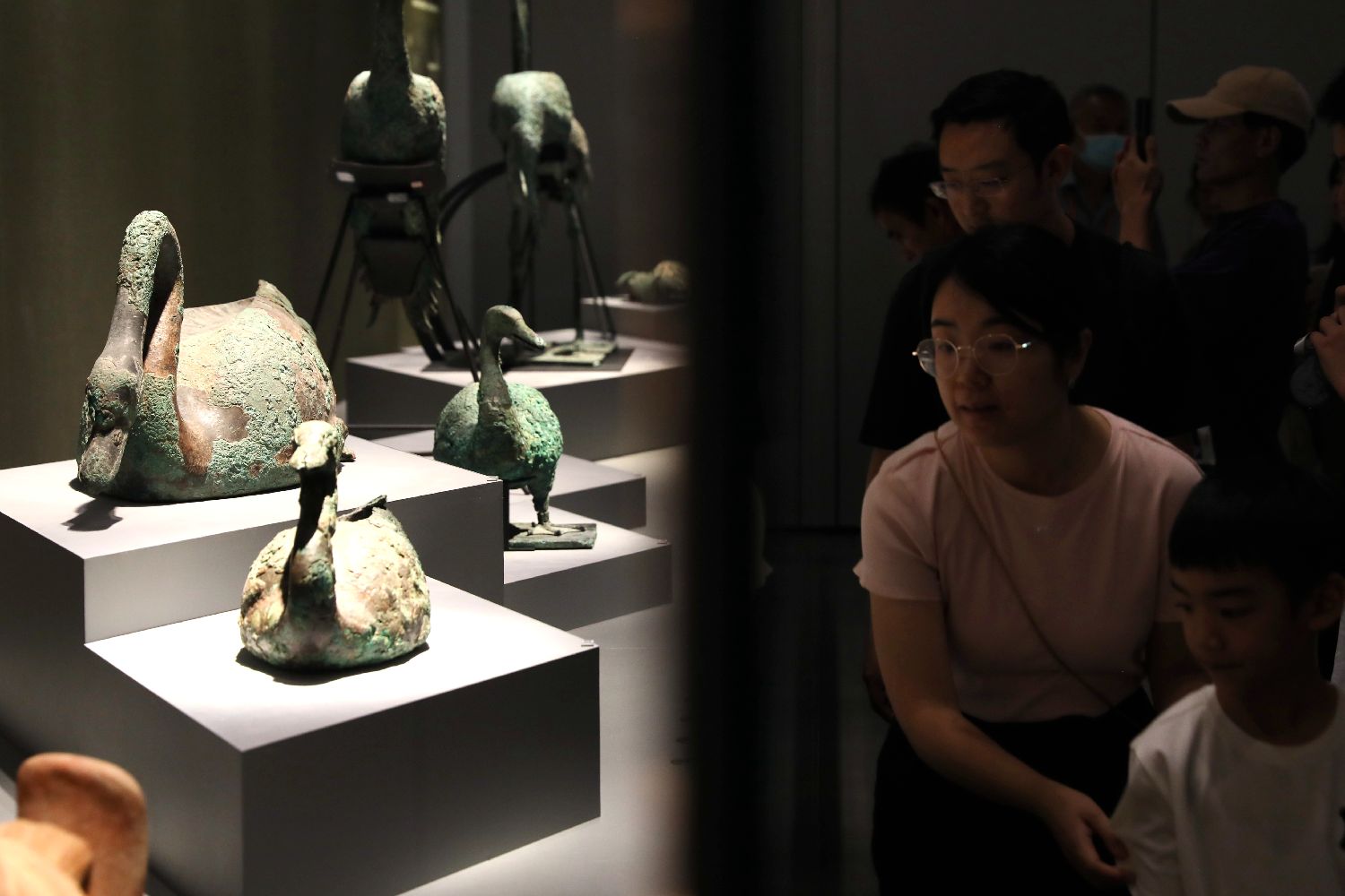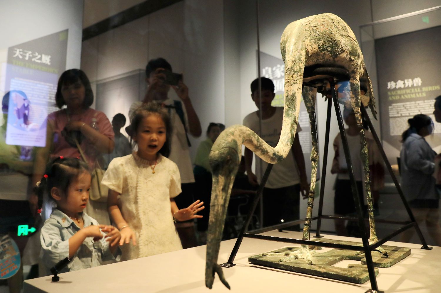 小朋友观看青铜鹤。中新社