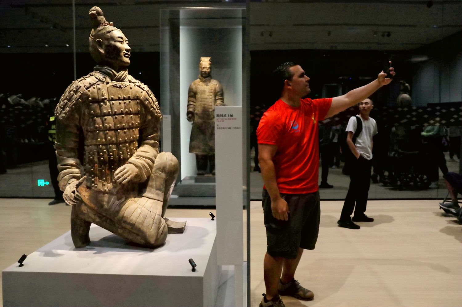 参观者和跪射武士俑自拍合影。中新社