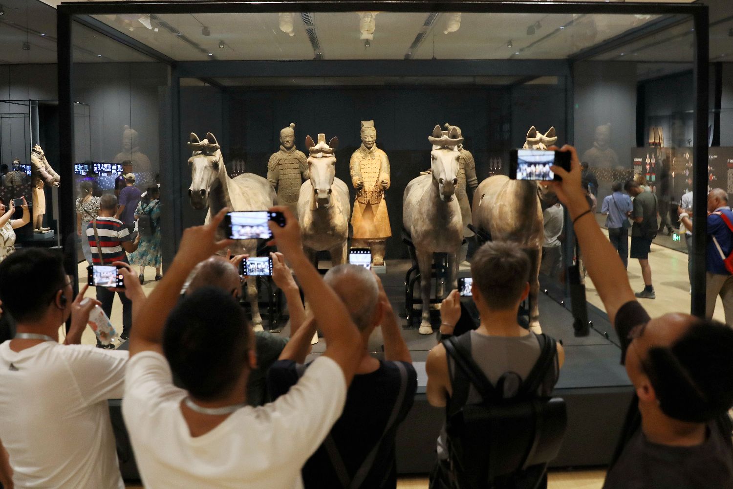 参观者拍摄展出的车马。中新社