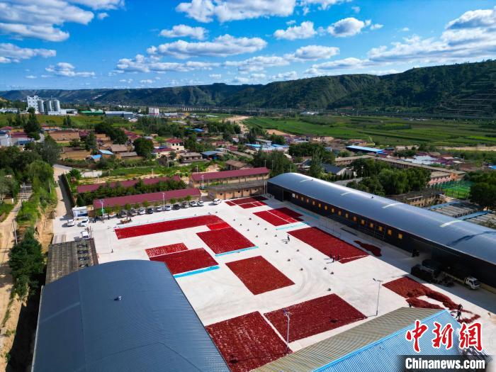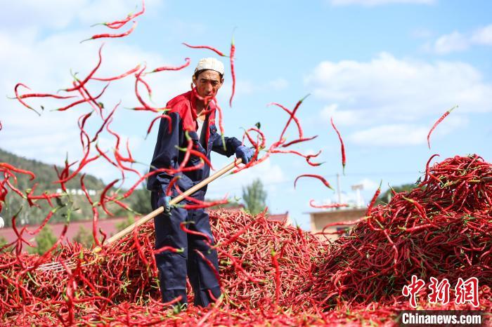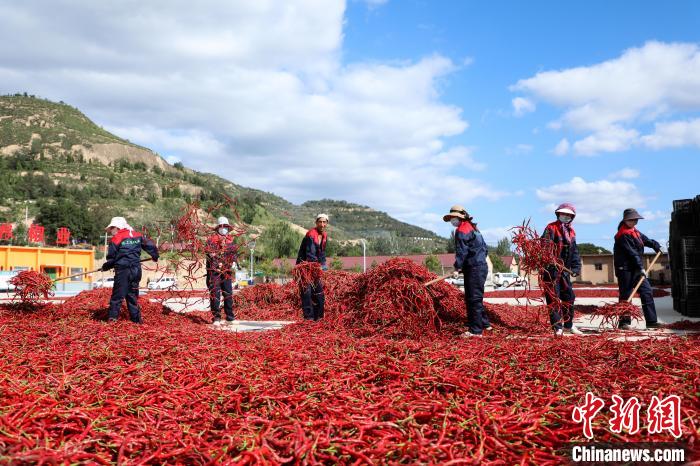 9月上旬,甘肃省庆阳市环县1.3万亩辣椒进入采摘晾晒期,村民们忙着向当地加工企业交售辣椒,加工企业忙着晾晒,“辣椒海洋”火红一片。据了解,环县当地的加工厂配备了剁椒生产线,对交售来的朝天椒进行及时加工,截至目前,已经加工近300吨辣椒酱,将销往湖南等地的食品企业。图为加工厂收购农户种植的辣椒。