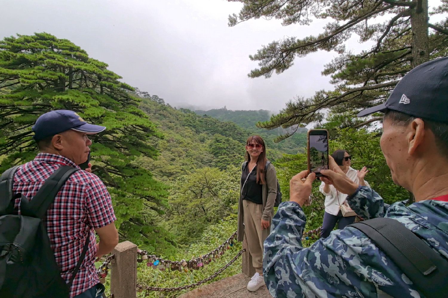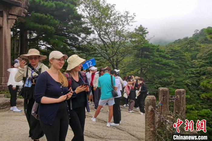 境外旅行商在黄山拍照留念。中新社