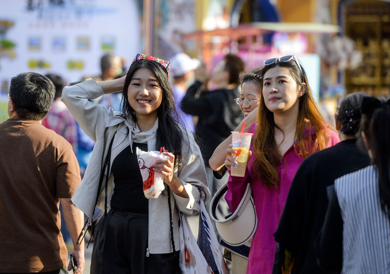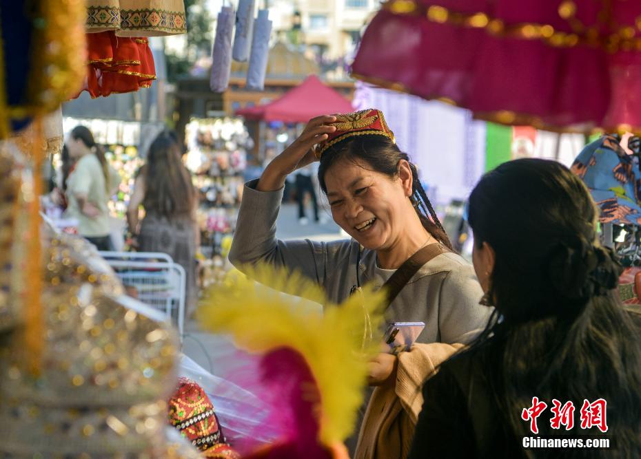 进入秋季,乌鲁木齐大巴扎景区旅游热度持续“在线”,各种民俗表演及丰富的特色旅游商品吸引来自中国各地的游客参观、游览、购物。图为9月12日,游客在大巴扎景区被各种民族乐器和工艺品所吸引。中新社