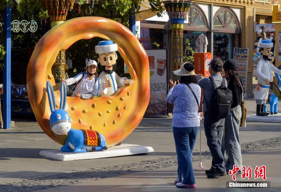 9月12日,游客与阿凡提主题雕塑合影留念。中新网