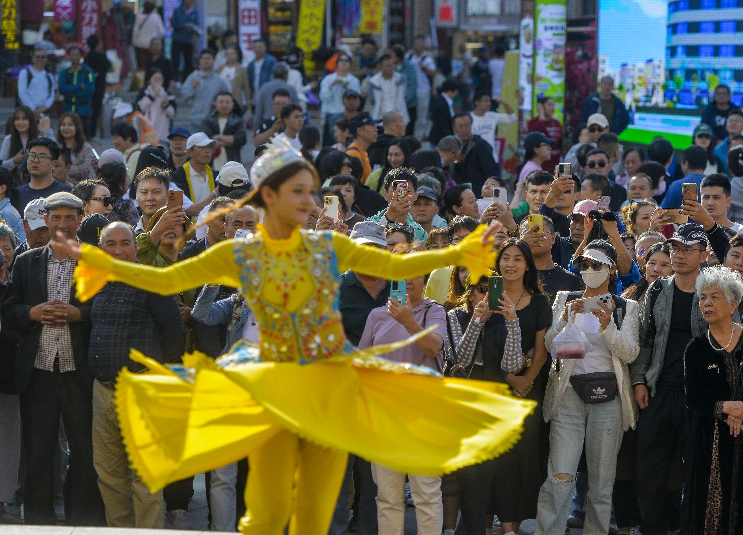 9月12日,民族舞蹈表演吸引众多游客围观。中新社