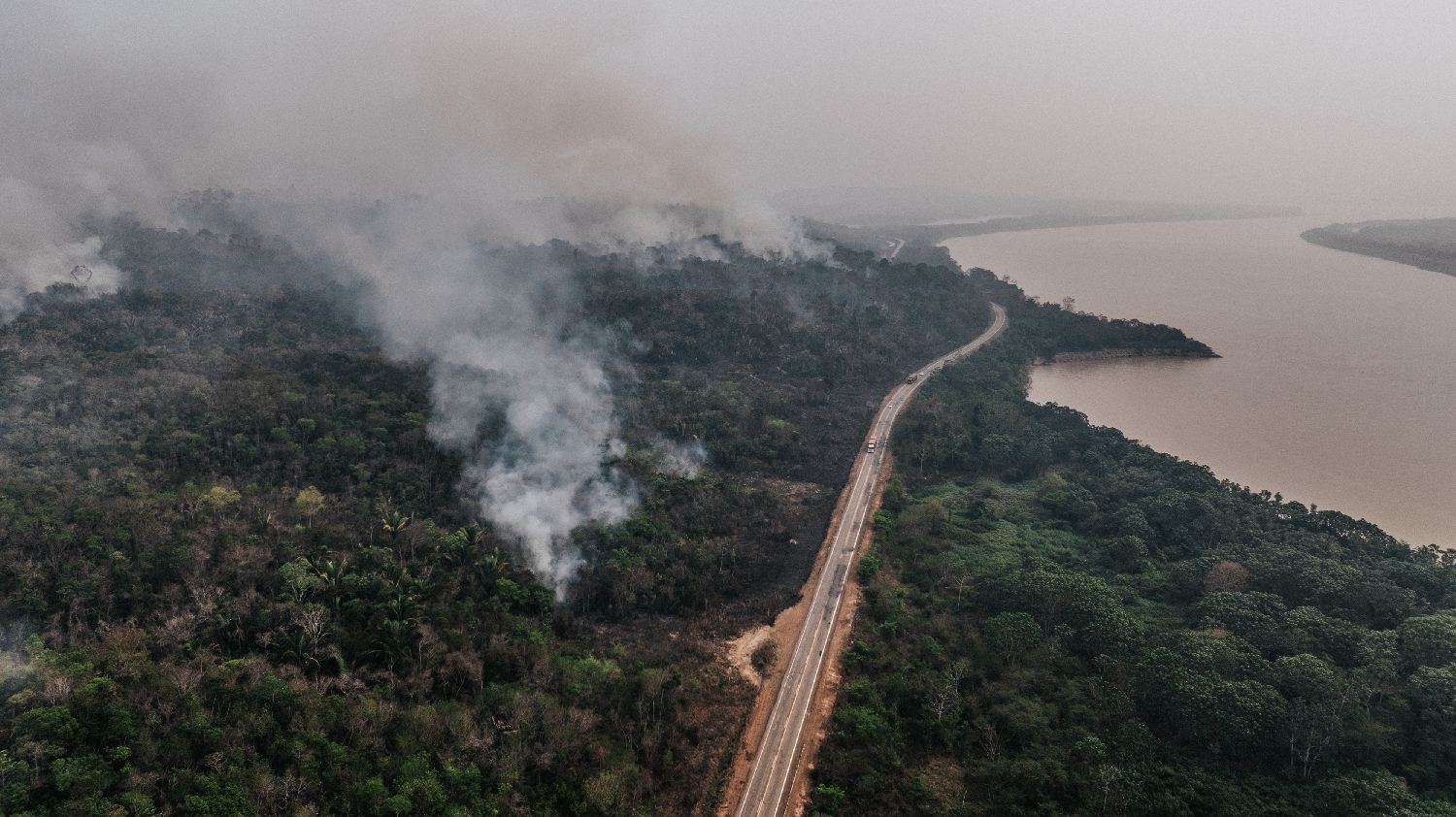 这是9月13日在巴西朗多尼亚州圣洛伦索拍摄的发生火灾的亚马孙森林和远处的马代拉河(无人机照片)。