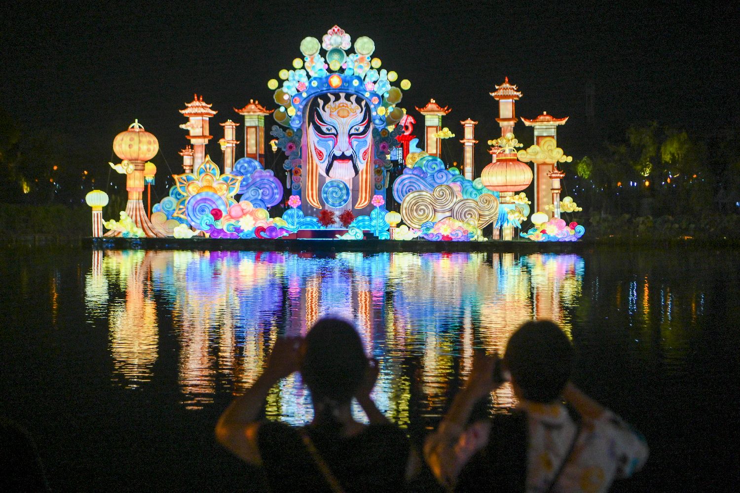 中秋节到来,中国各地开展丰富多彩的活动,人们在感受传统民俗文化的同时,喜迎中秋佳节。图为9月15日晚,“大观奇妙夜”活动在云南省昆明市大观公园正式开放,“戏说云南”彩灯吸引游客拍照。中新社
