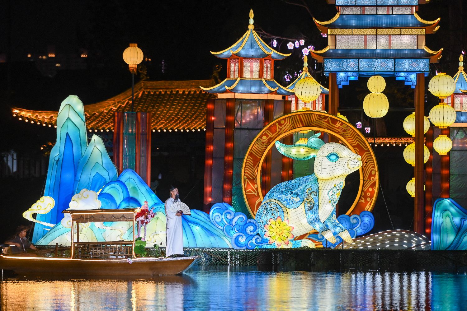 9月15日晚,“大观奇妙夜”活动在云南省昆明市大观公园正式开放。图为演员在“海上生明月”彩灯前朗诵大观楼长联。中新社