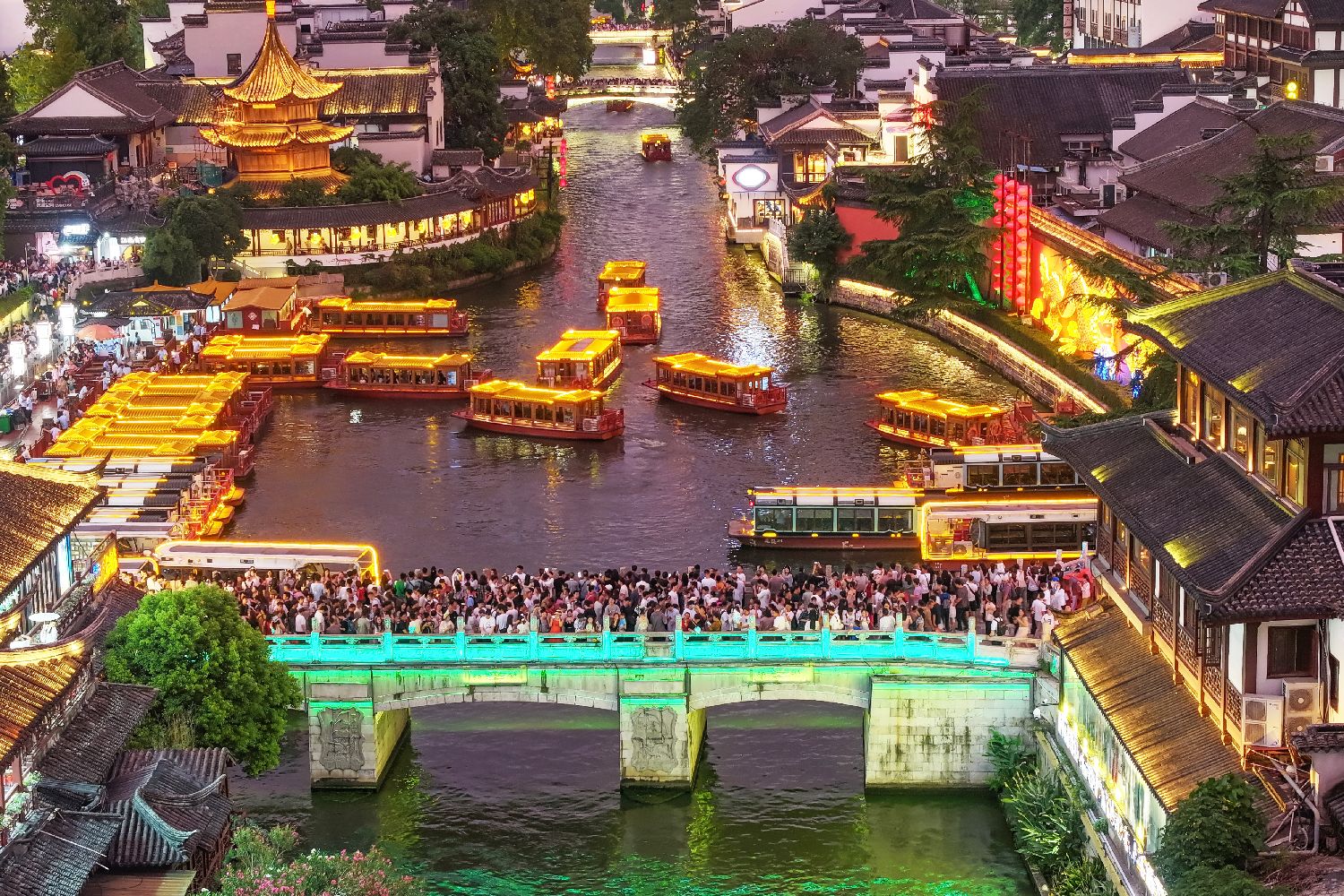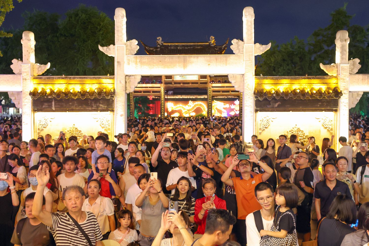 9月15日晚,游客们在江苏省南京市秦淮河畔夫子庙景区内游玩。中新社