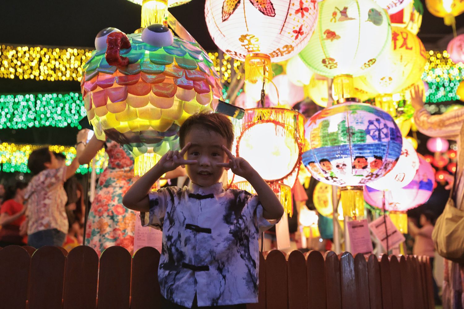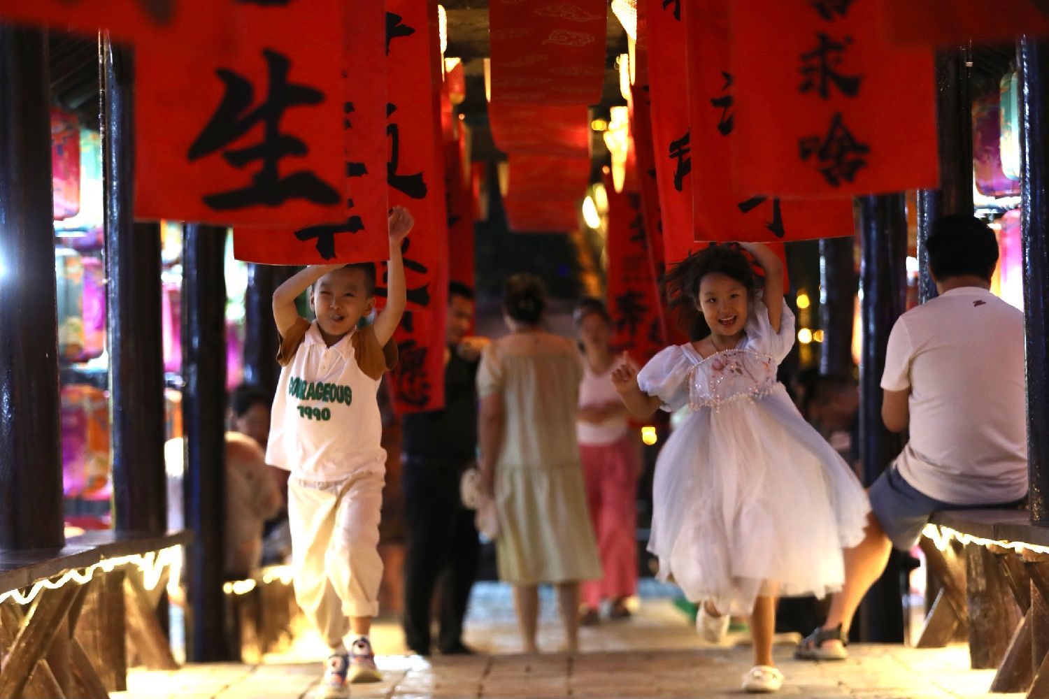 9月15日,民众夜游陕西省西安市某民俗小镇。图为小朋友在小镇内玩耍。中新社