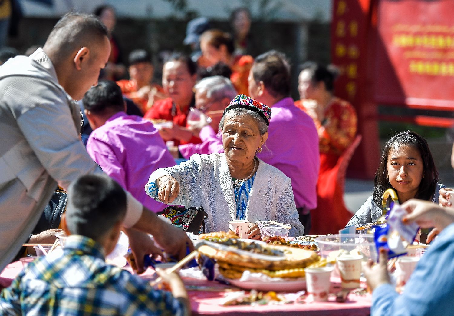 9月15日,新疆乌鲁木齐市天山区固原巷社区举办“中秋月圆百家宴”活动,居民端来自家制作的美食,围坐在一起品尝佳肴,共叙佳话,迎接中秋佳节到来。中新社