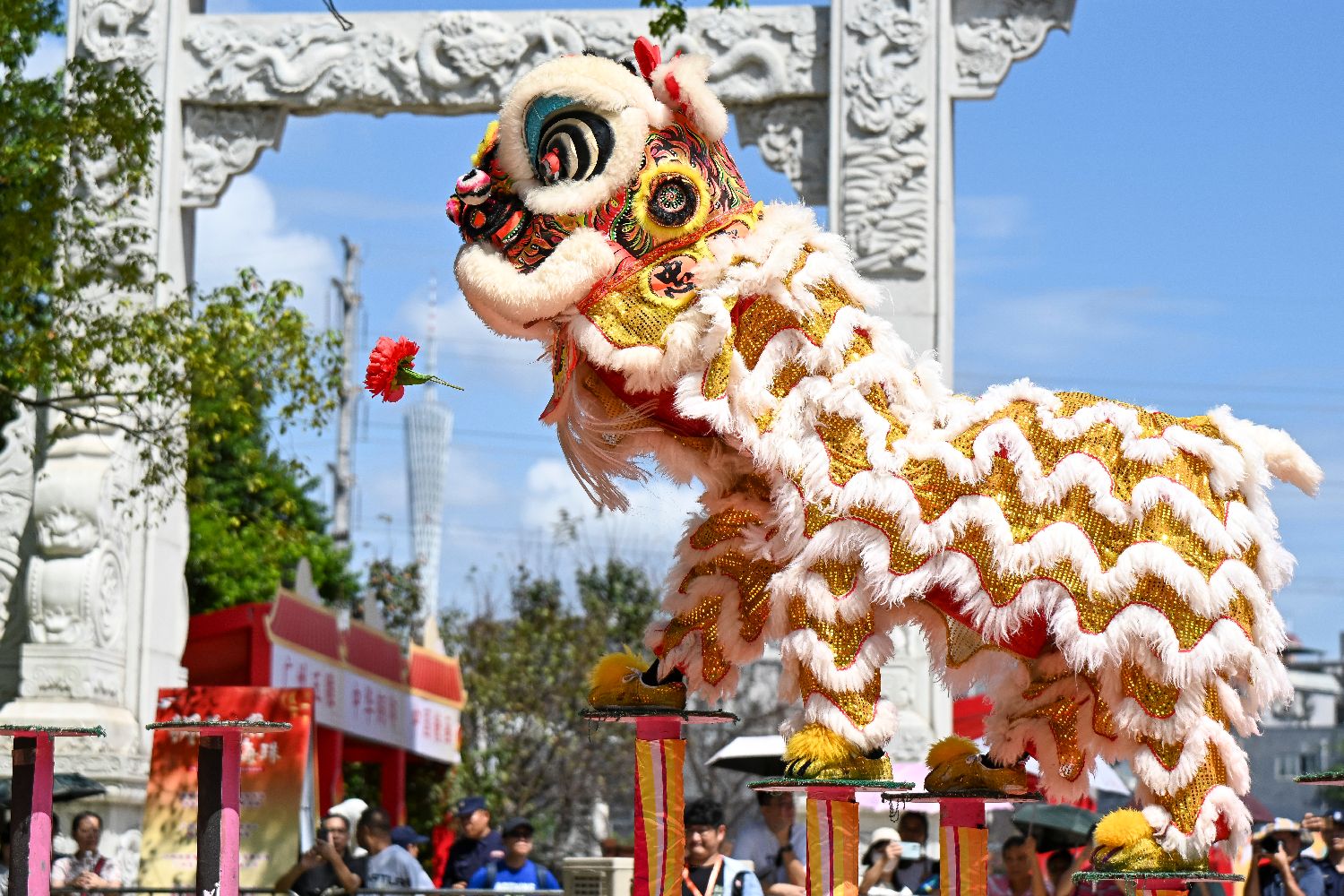 9月15日,广东省广州市海珠首届狮王争霸赛在海珠湿地开赛,来自岭南地区的24支醒狮队伍,上百名选手同台竞技,在中秋假期期间向游客献上一场极具民族特色的体育盛宴。图为醒狮在高桩上表演技法。中新社