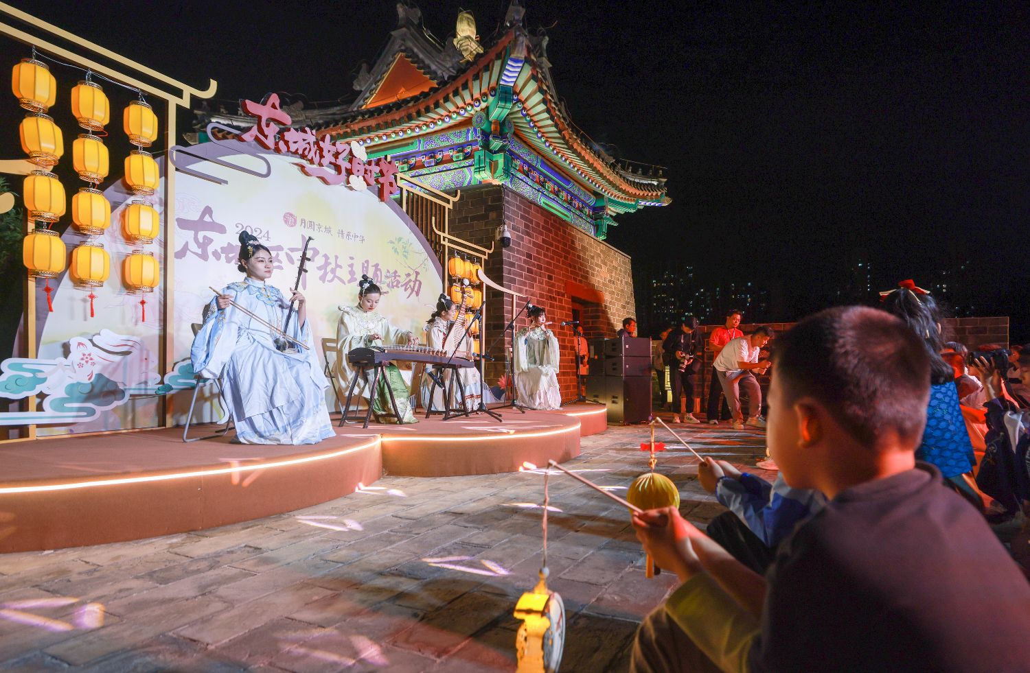 9月14日晚,北京市东城区中秋主题活动的首场活动——中秋诗会在角楼图书馆举行。诗会通过诗朗诵、民乐合奏、古琴独奏等形式展现月光与古建筑的宁静悠远以及其所承载的绵长情思。图为民乐联奏表演。中新社