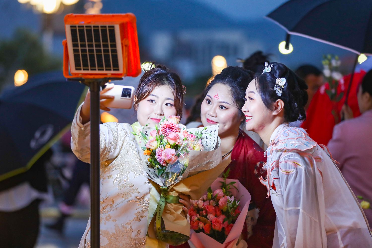 9月13日晚,2024年甘肃省“我们的节日·中秋”主题文化活动在兰州市雁滩公园启动。图为身着汉服的青年志愿者合影留念。新华社