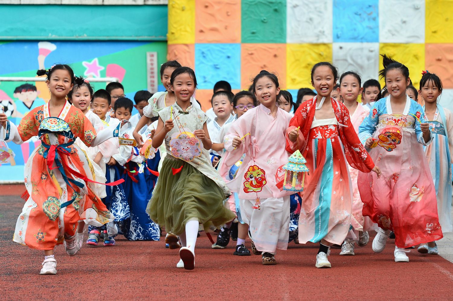 9月13日,在山东省青岛市宜阳路小学开展的“多彩民俗迎中秋”主题活动上,孩子们手提花灯巡游。新华社