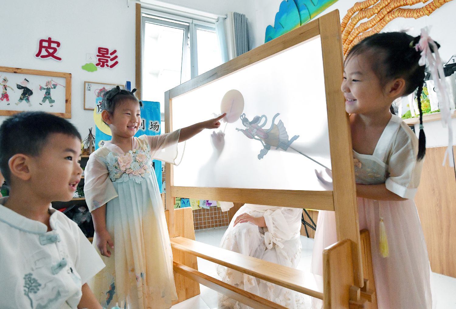 9月14日,河北省石家庄市桥西区际华苑幼儿园的小朋友表演皮影戏《嫦娥奔月》。新华社