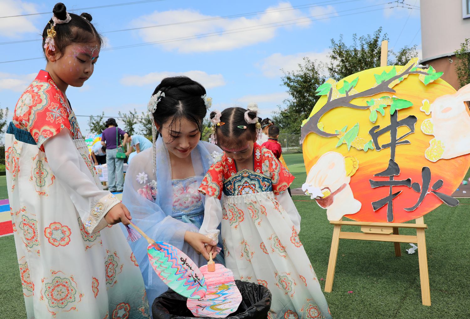 9月15日,在山东省博兴县金色摇篮幼儿园举办的“汉风雅韵 畅游中秋”活动现场,一名家长和小朋友一起动手制作漆扇。新华社