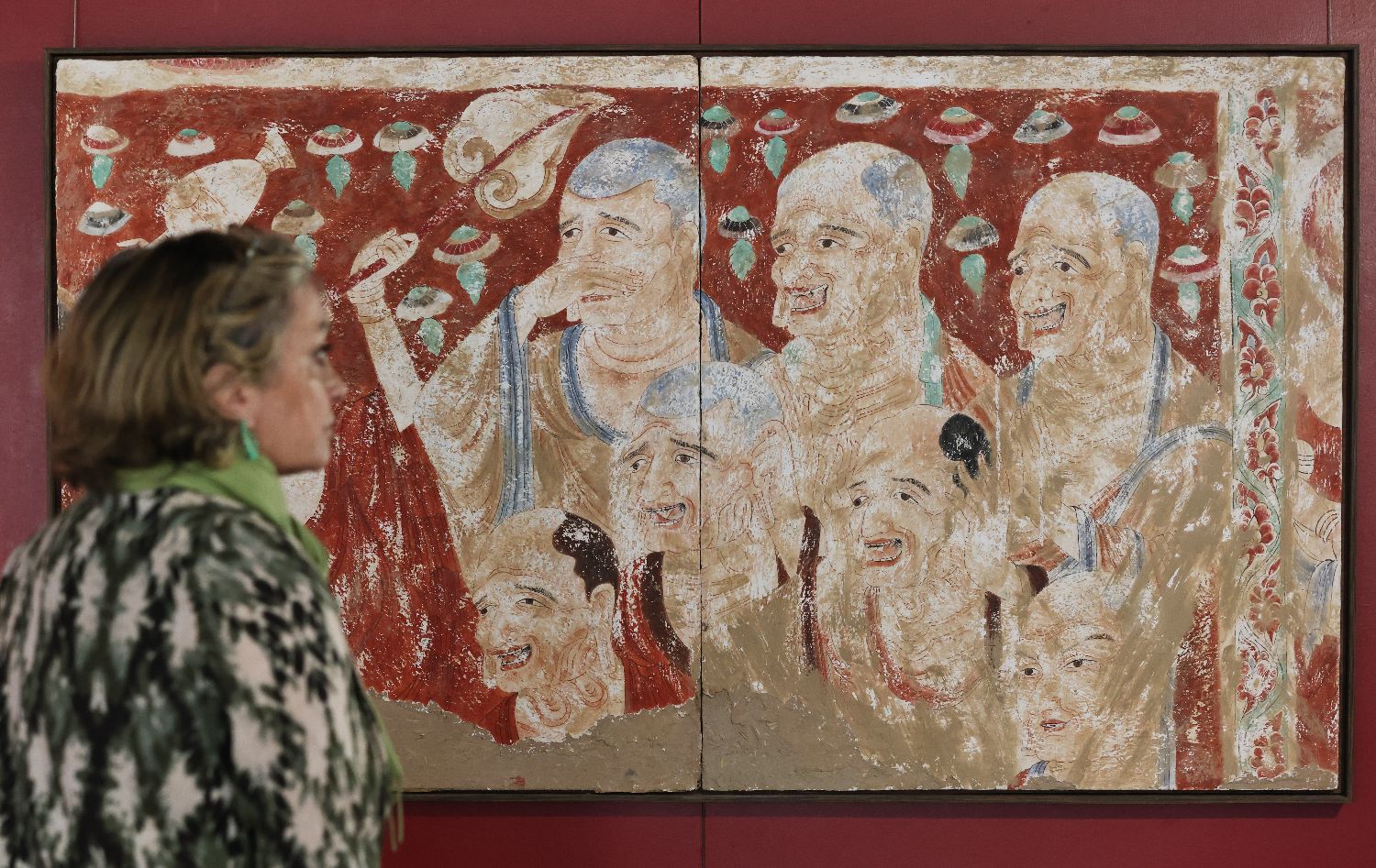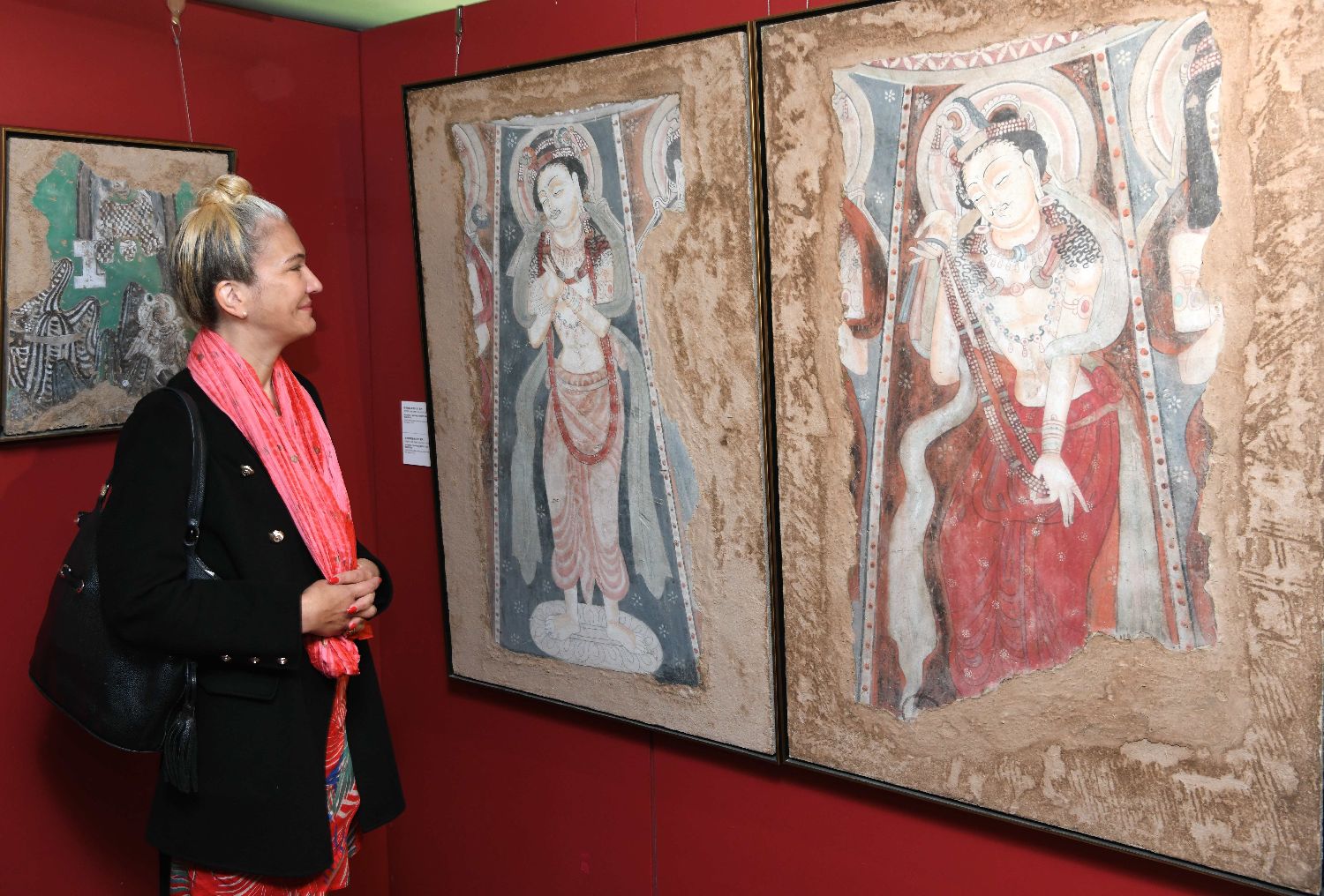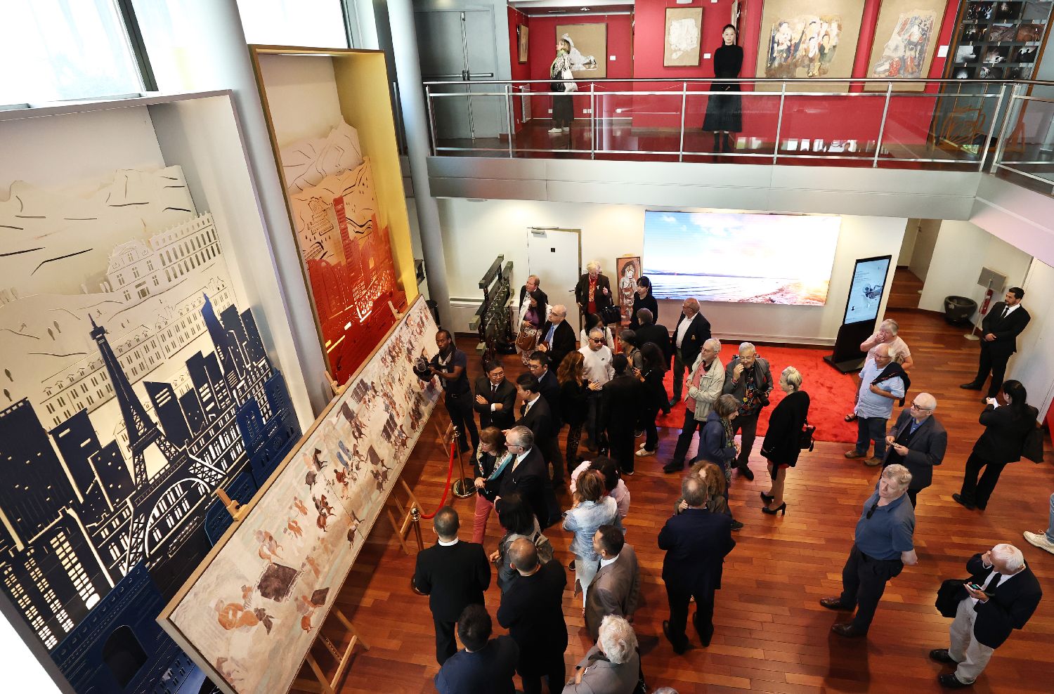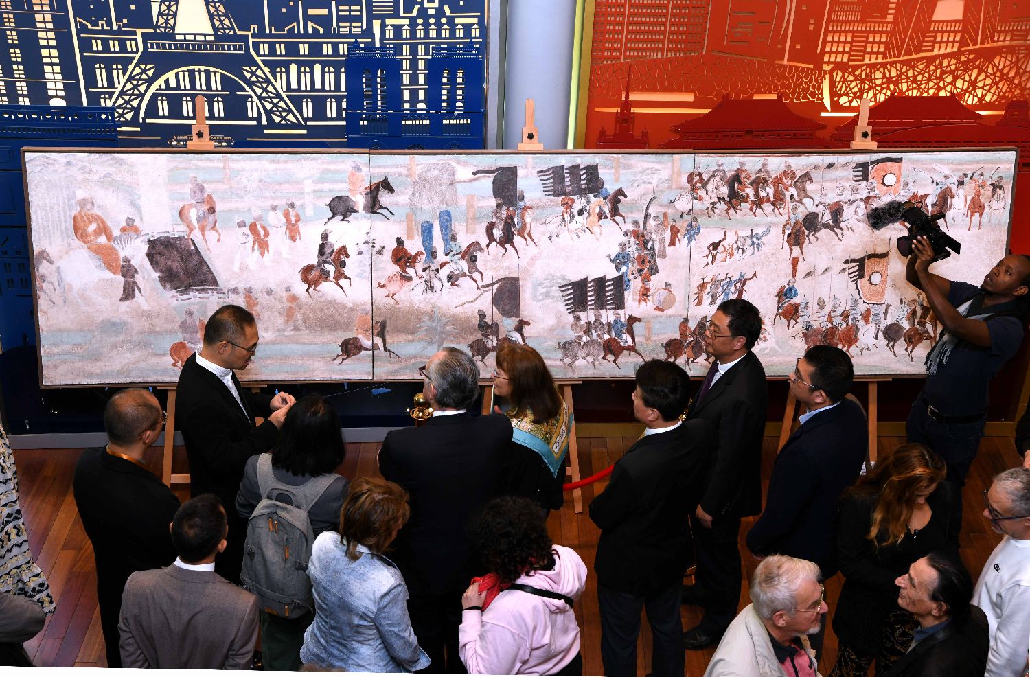 当地时间9月18日,“丝路丹青——丝绸之路沿线壁画传摹展”在巴黎揭幕。展览由中国艺术研究院和巴黎中国文化中心主办。图为嘉宾和各界人士在开幕式上观看壁画临摹作品。中新社