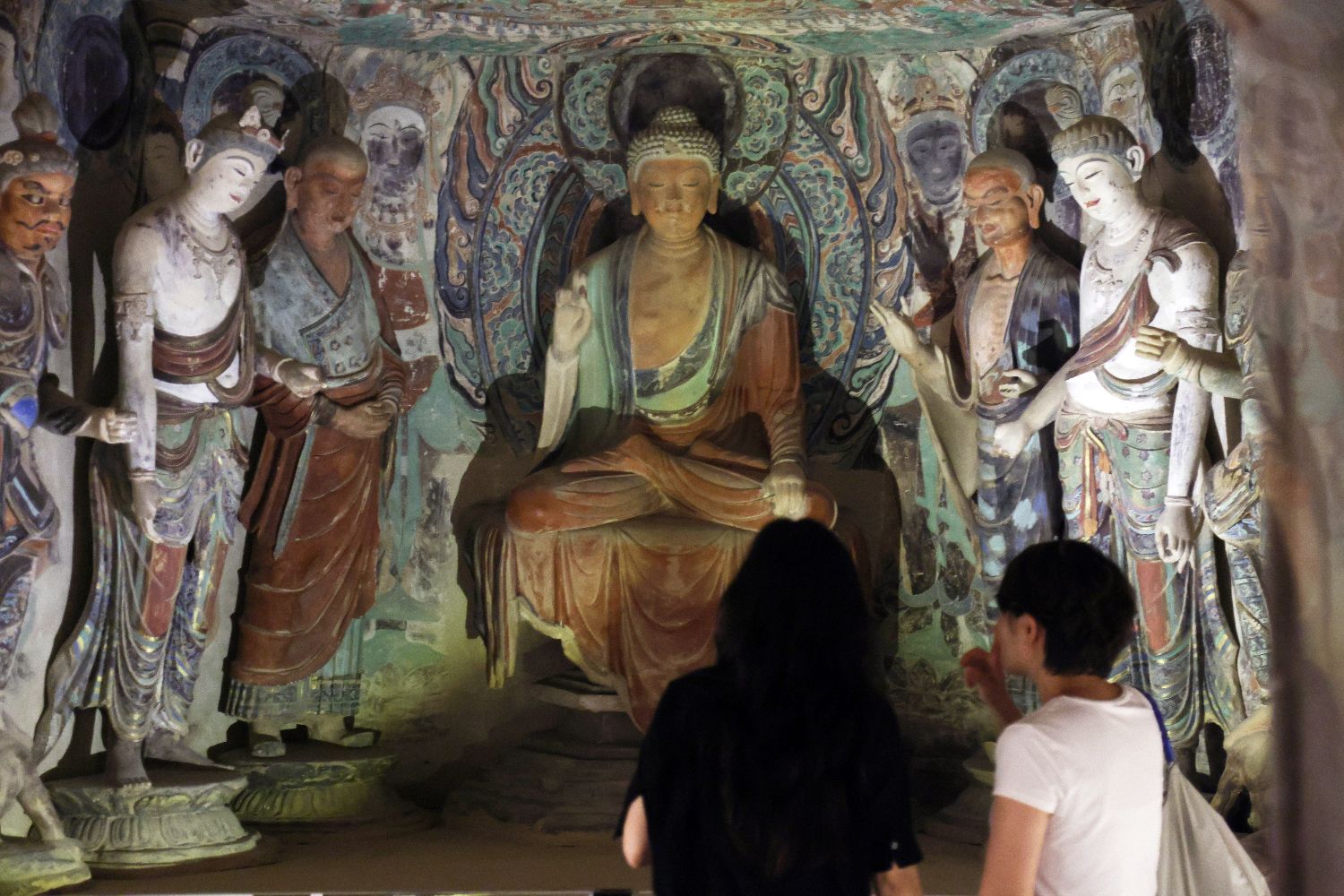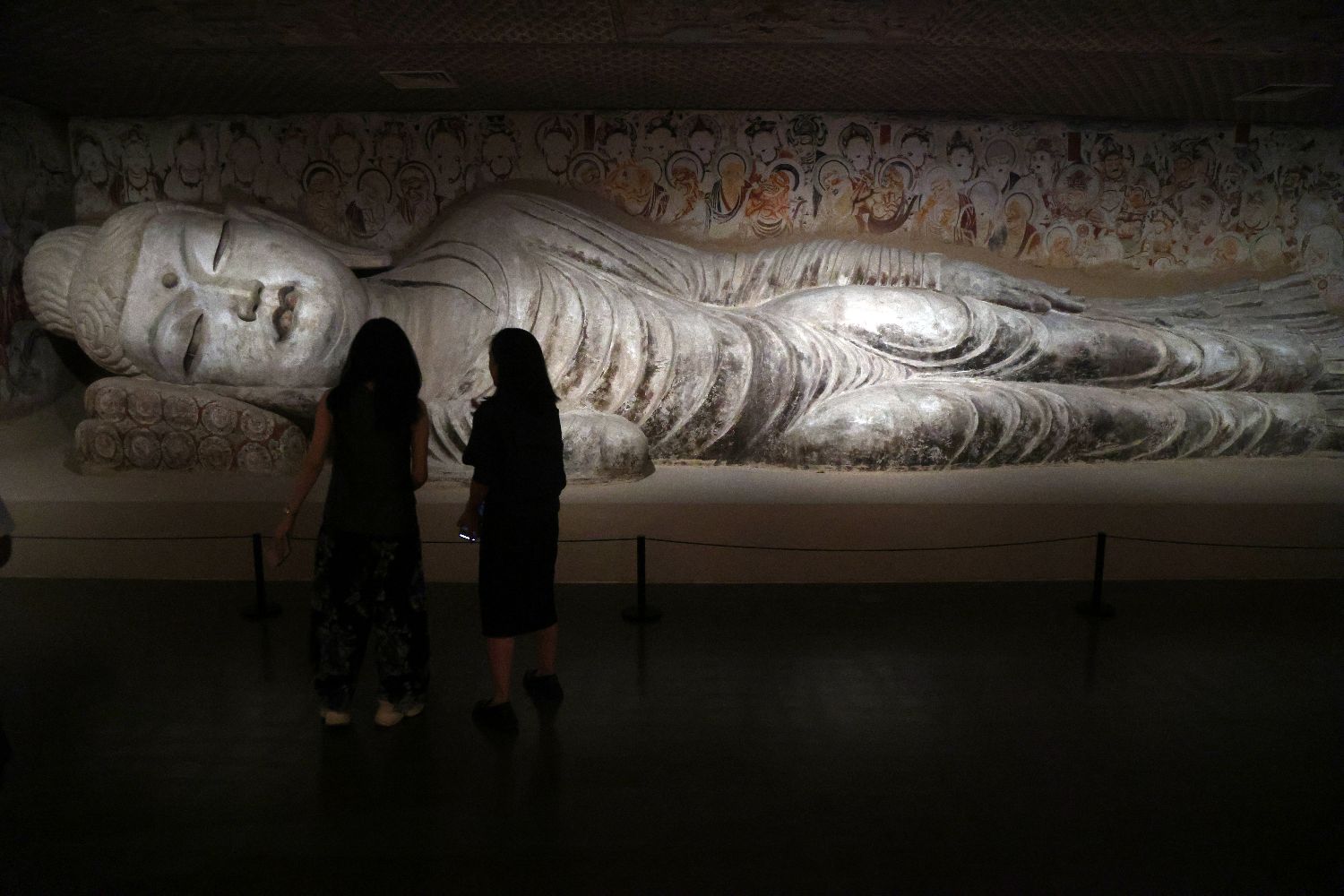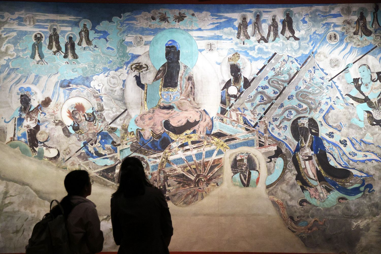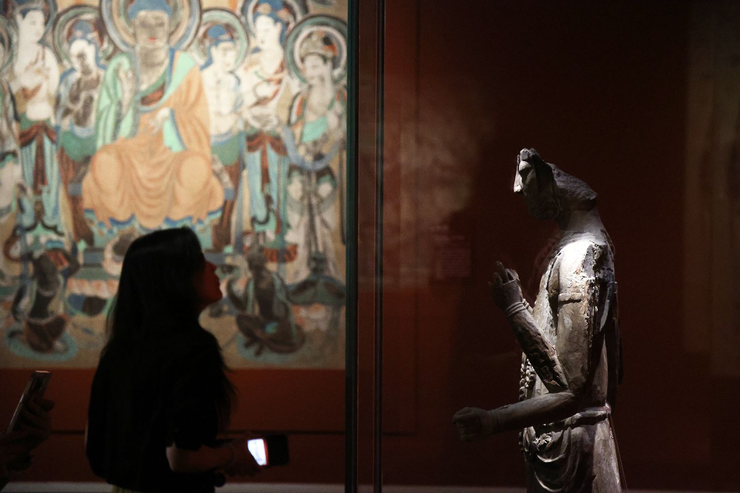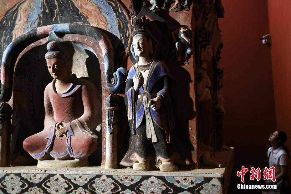 “何以敦煌”敦煌艺术大展将于9月20日在中华艺术宫(上海美术馆)开幕并对公众开放。本次展览以“文物+复刻经典洞窟+壁画彩塑”为形式,从敦煌研究院调集大批极具代表性、极具稀缺性的一二级珍贵文物及临本等,包括禁止出境文物,以及多件首次赴上海展出文物,并1:1原窟复刻莫高窟经典石窟群,让观众能够身临其境的“在上海,看敦煌”。图为9月18日,敦煌文化艺术展品吸引观众。中新社