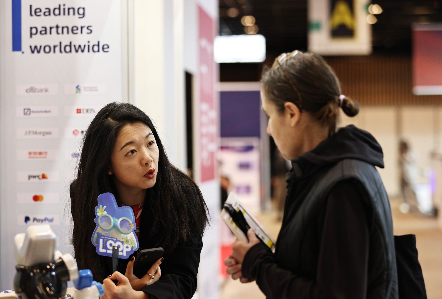 9月17日,在法国巴黎凡尔赛门展览中心,一名参观者在“中国贸促”(法国)创新合作展览会上咨询。