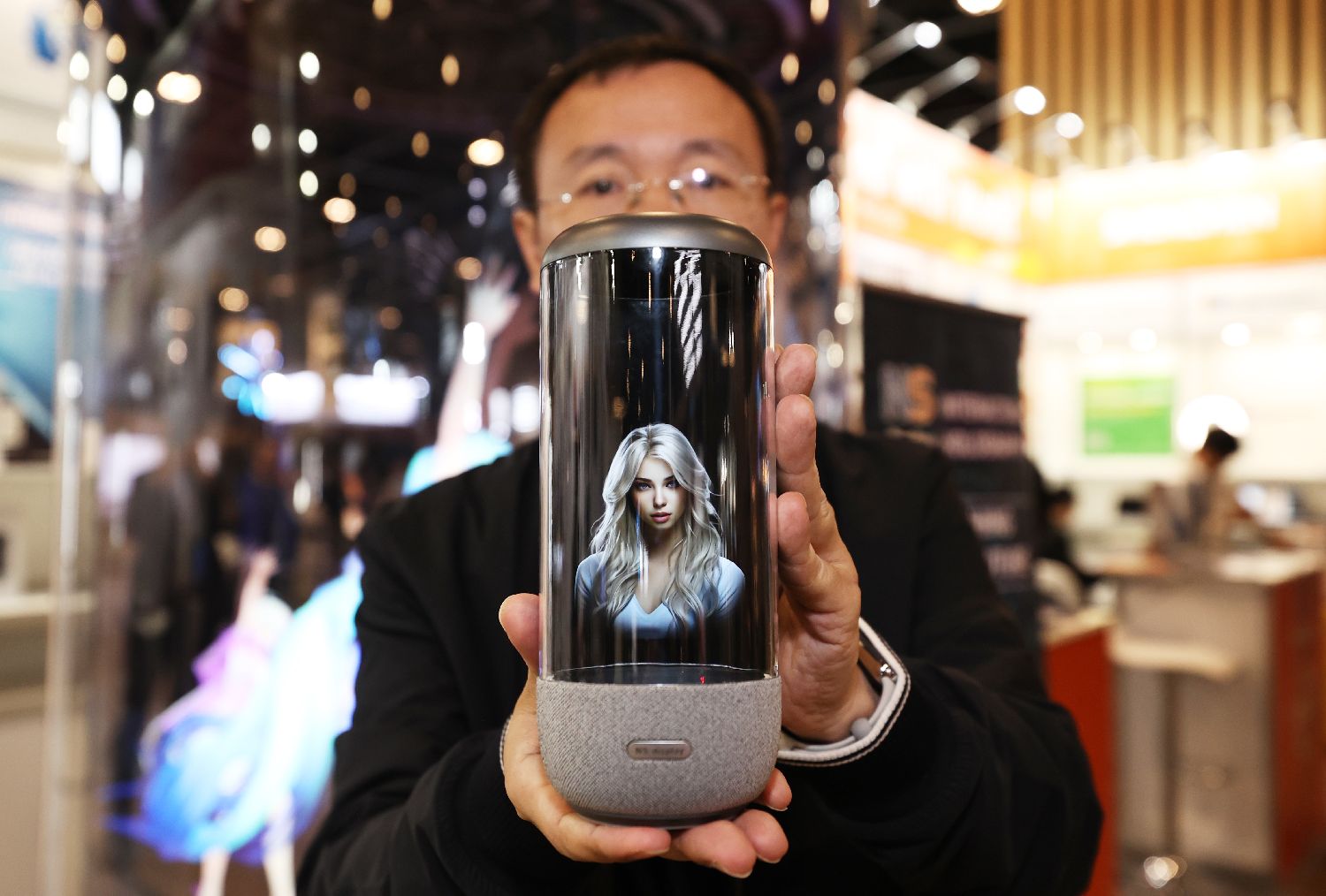 9月17日,在法国巴黎凡尔赛门展览中心举行的“中国贸促”(法国)创新合作展览会上,工作人员展示中国人工智能全息数字人一体机的某款产品。