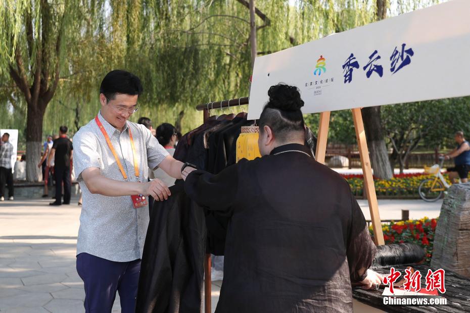 嘉宾在北京(通州)大运河文化旅游景区内非遗集市上体验香云纱制品。中新网