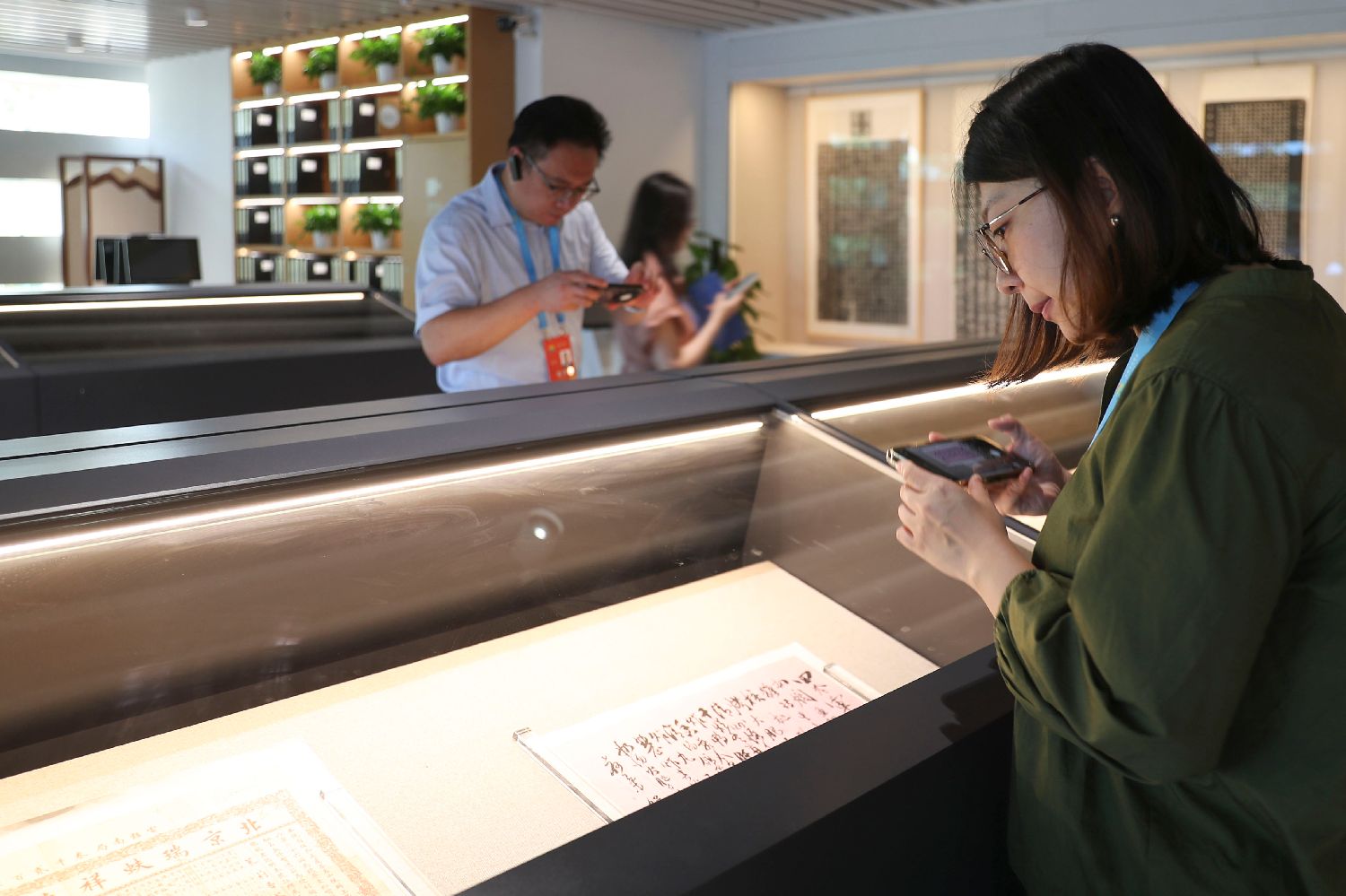 9月19日,2024北京文化论坛在北京开幕,部分参与论坛的嘉宾参加通州区线路观摩。图为嘉宾在北京城市图书馆非遗文献馆内观看展陈。中新社