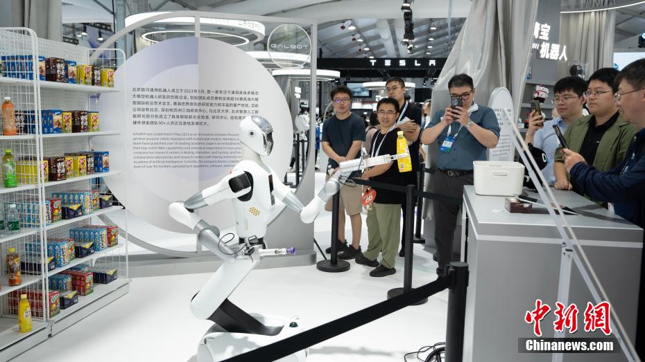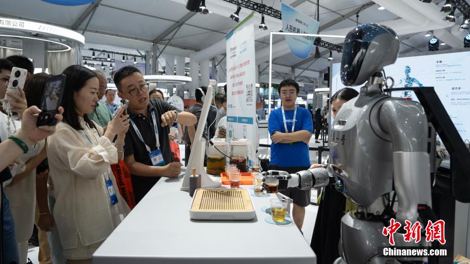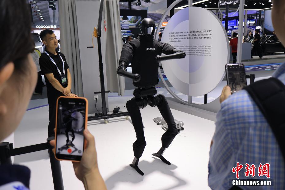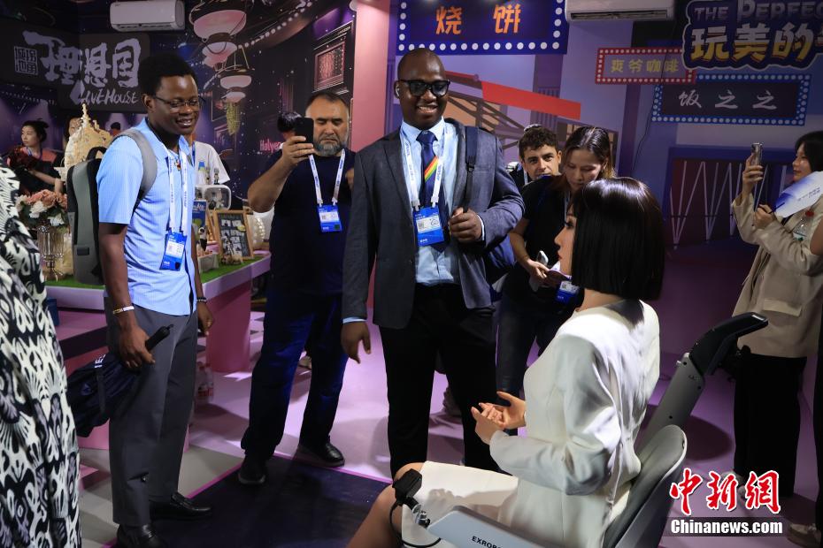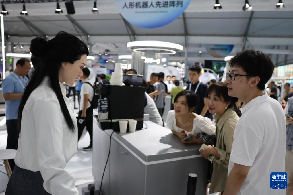 观众在前沿应用展馆与人形机器人互动。新华社