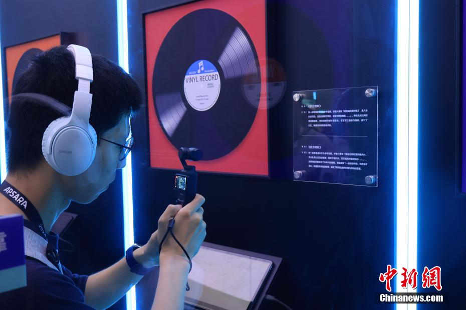 一名观众在云栖大会试听由AI生成的歌曲并拍照“打卡”。中新网