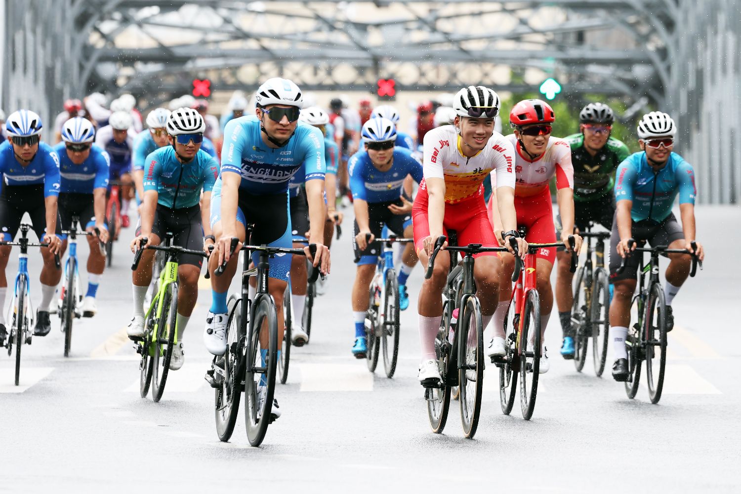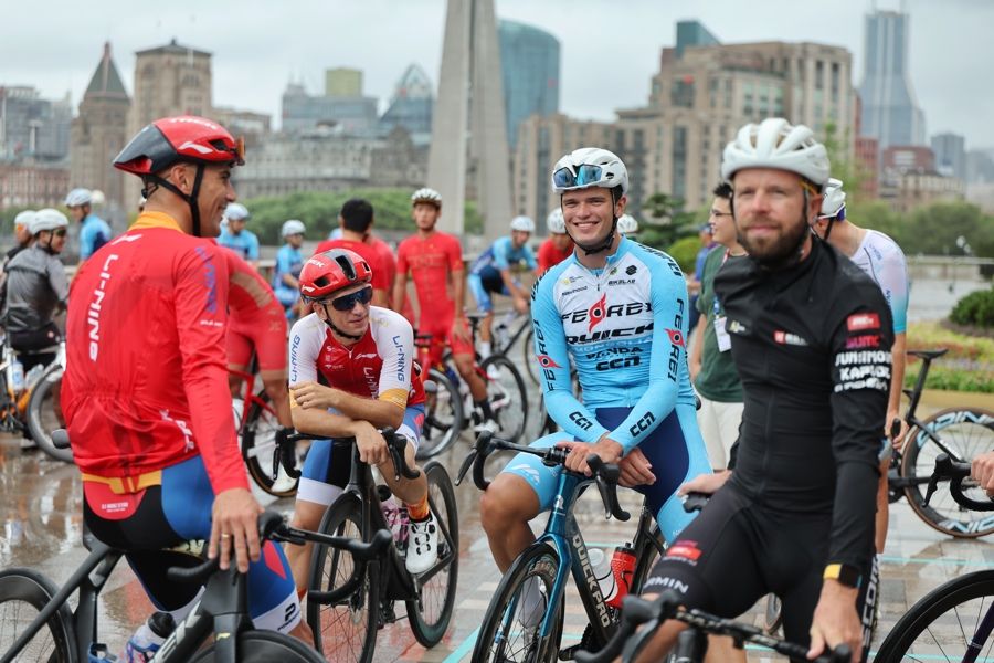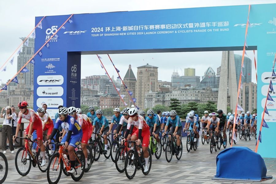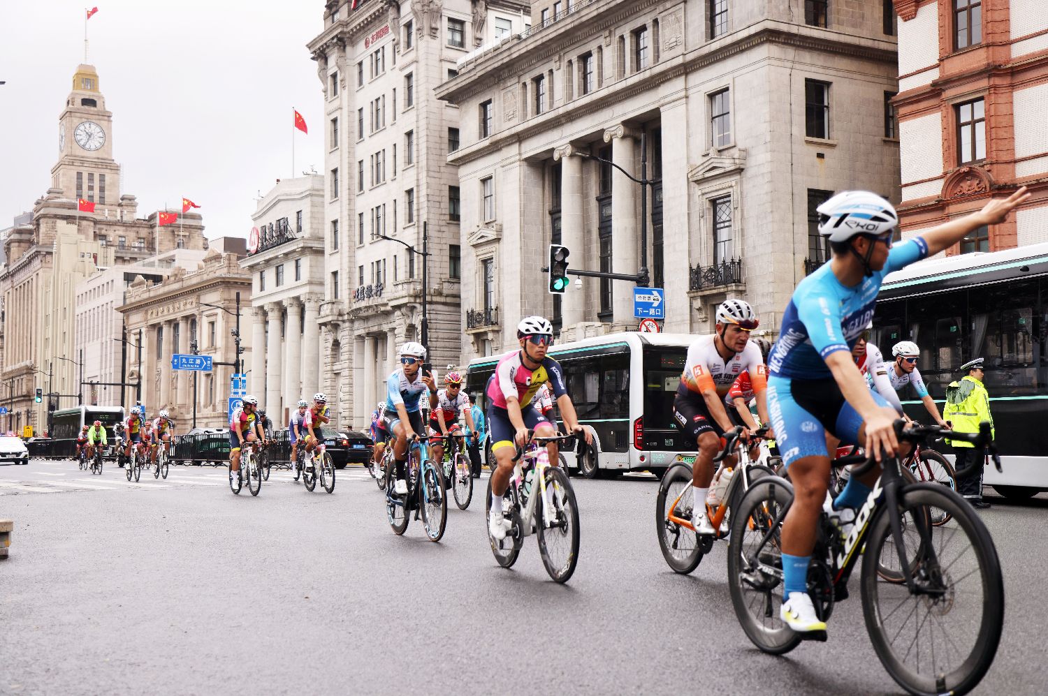 9月19日,2024环上海·新城自行车赛正式启幕。来自中国、法国、阿联酋、蒙古、哈萨克斯坦、印度尼西亚等国家及地区的20支职业车队将参与角逐。图为当日,一场盛大的自行车巡游活动在上海外滩上演,来自世界各地的职业车手巡游黄浦江畔吸引了众多路人的目光。中新社