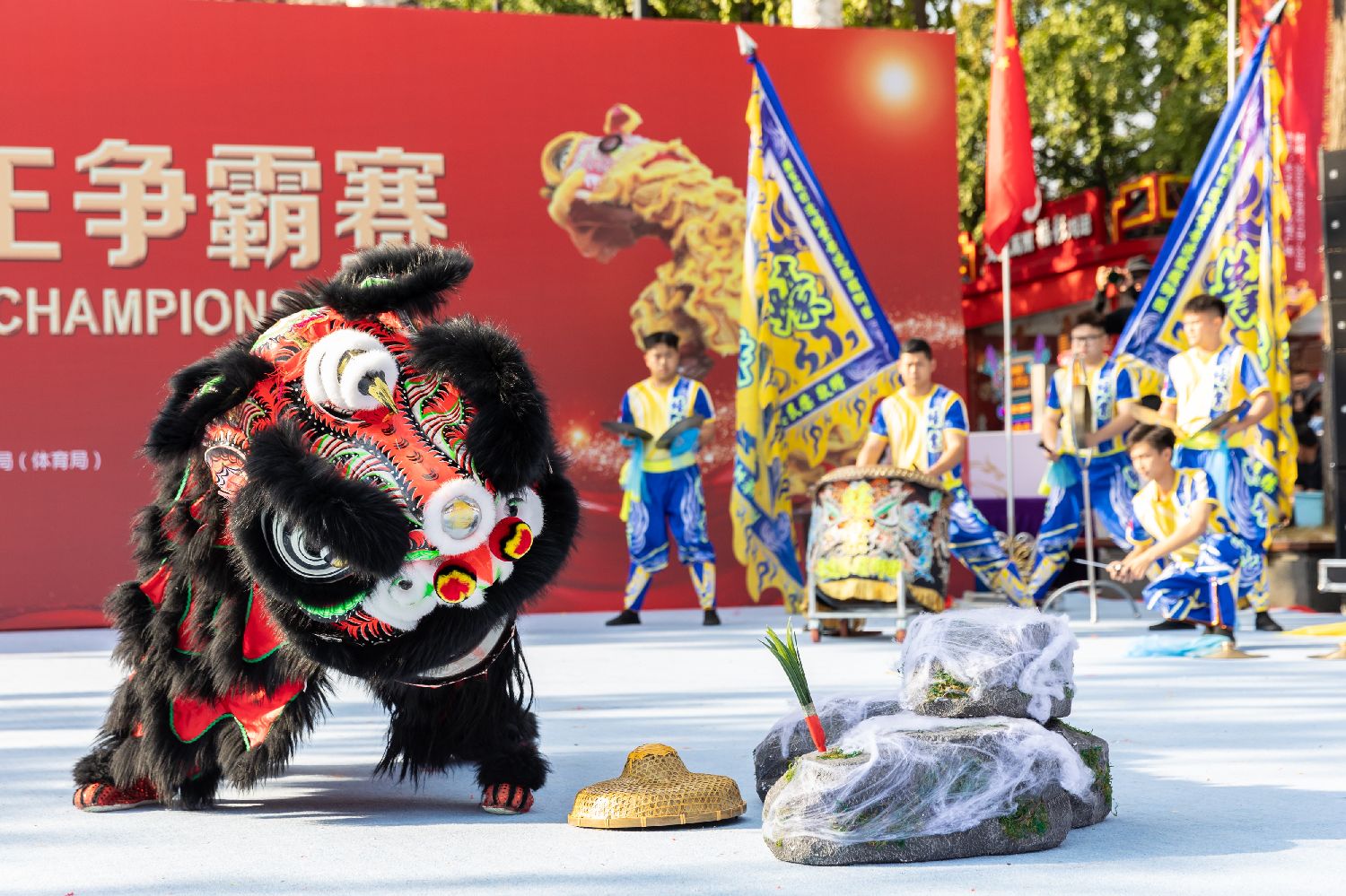 9月22日,中国深圳市宝安区西乡蚝业黄连胜醒狮团队选手比赛中。新华社