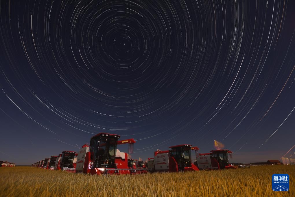 丰收时节,黑龙江省各地稻菽飘香,金黄遍野。夜幕降临,“北大仓”更显静谧丰腴,一幅丰收画卷在星光下徐徐展开。图为9月18日在北大荒集团黑龙江七星农场有限公司拍摄的星空下的稻田中的收割机(堆栈合成照片)。