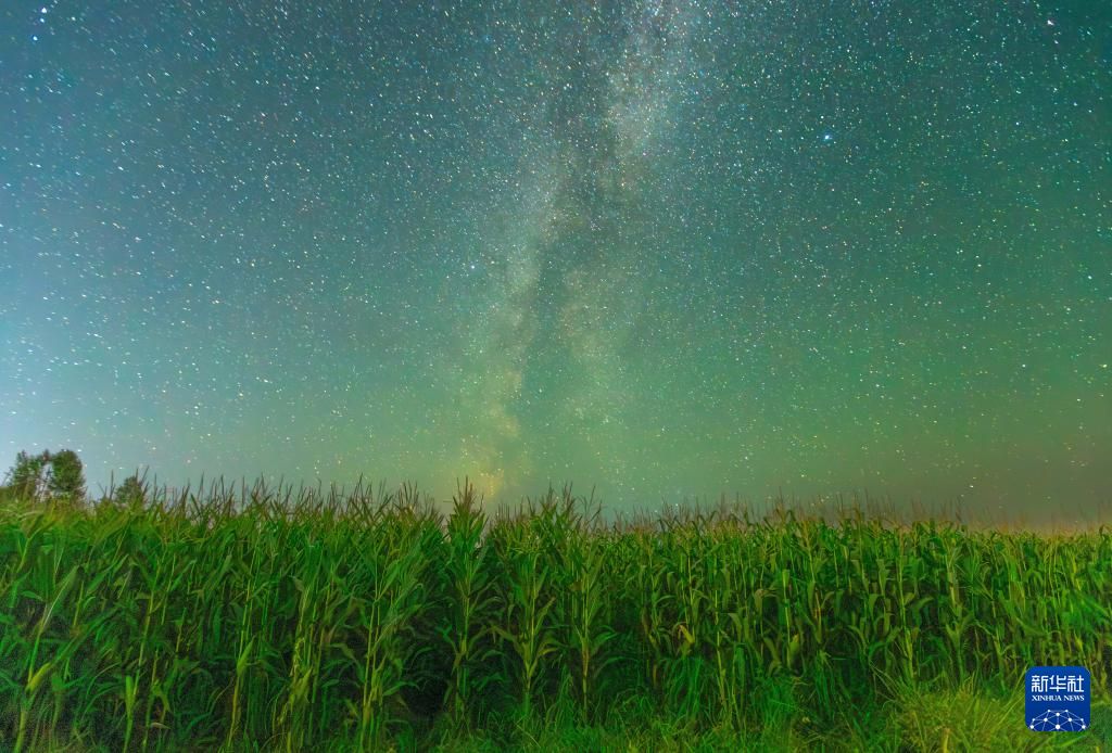 9月9日在黑龙江省汤原县胜利乡新丰村拍摄的星空下的玉米地。