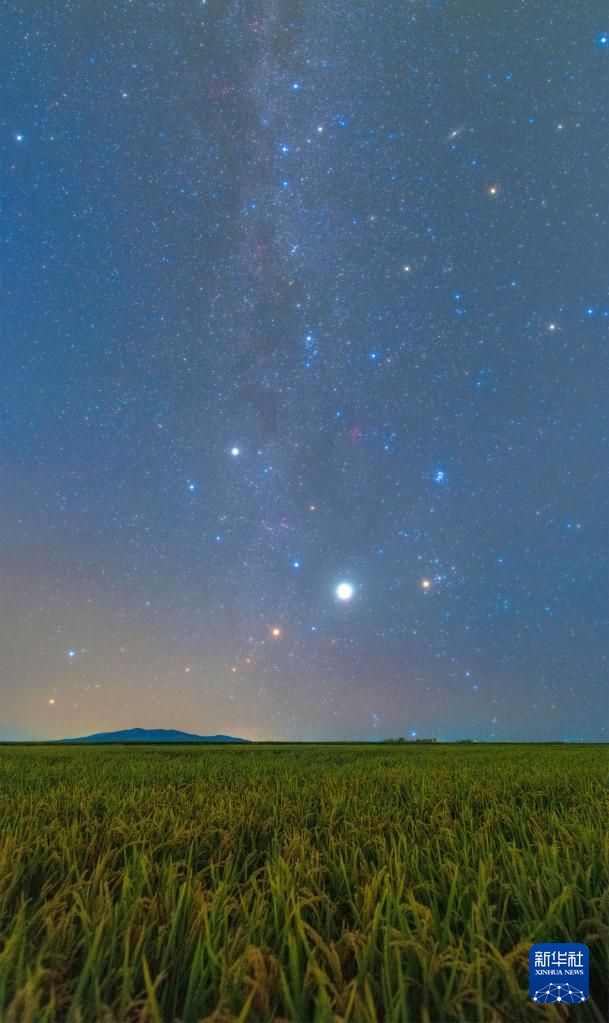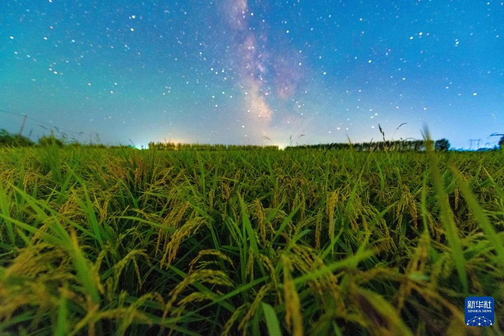 8月27日在黑龙江省富锦市长安镇靖安村拍摄的星空下的稻田。