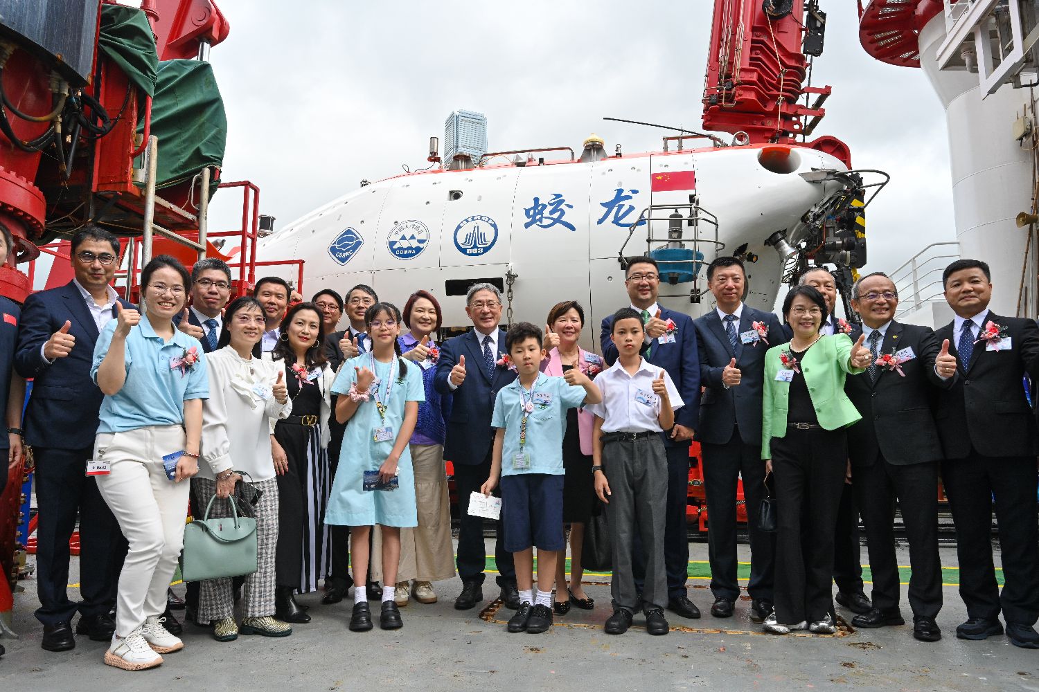 香港特区政务司副司长卓永兴(后排中)登船参观停靠香港的“深海一号”科考船携“蛟龙号”载人潜水器,并与嘉宾及学生代表在“蛟龙号”前合照。香港中通社