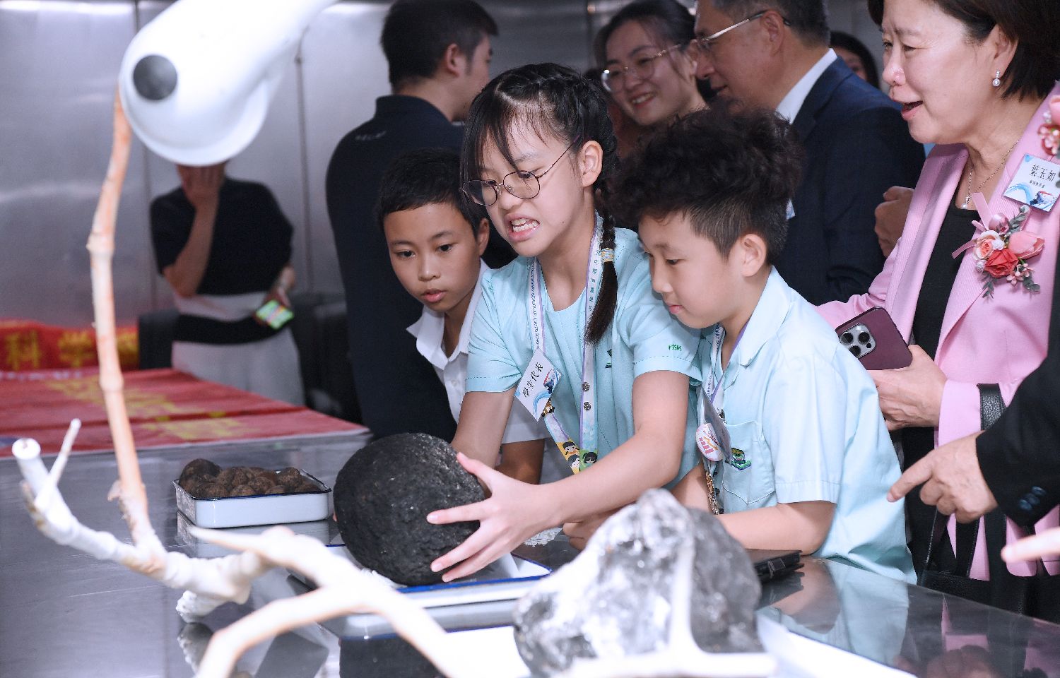 香港小学生代表在“深海一号”远洋科考船上参观地质实验室。新华社