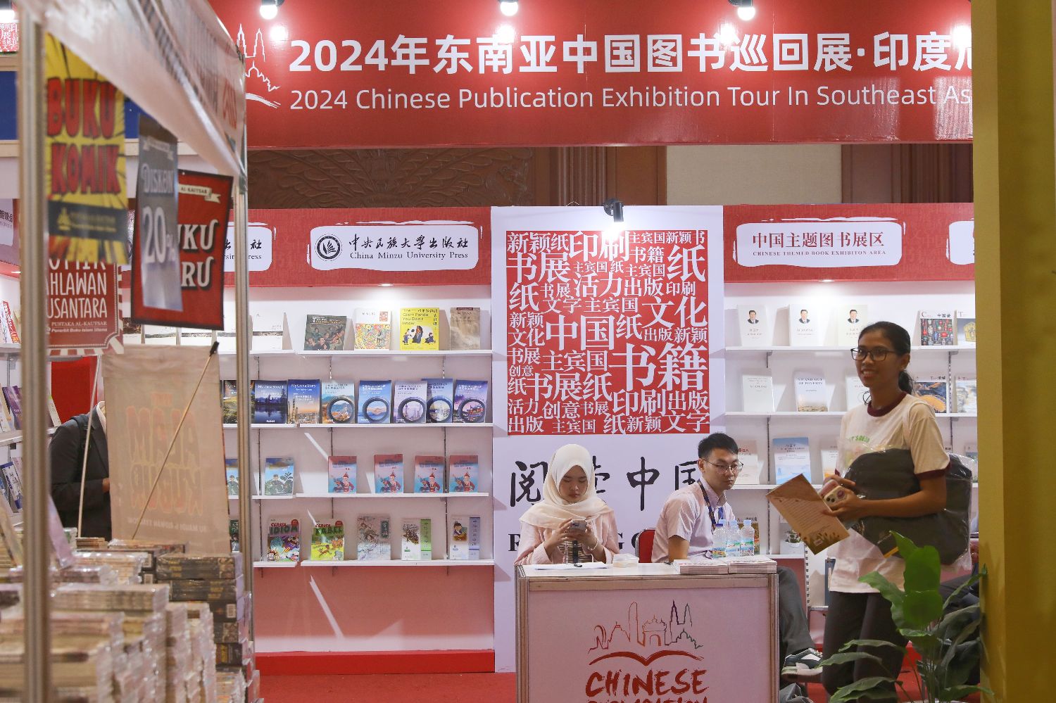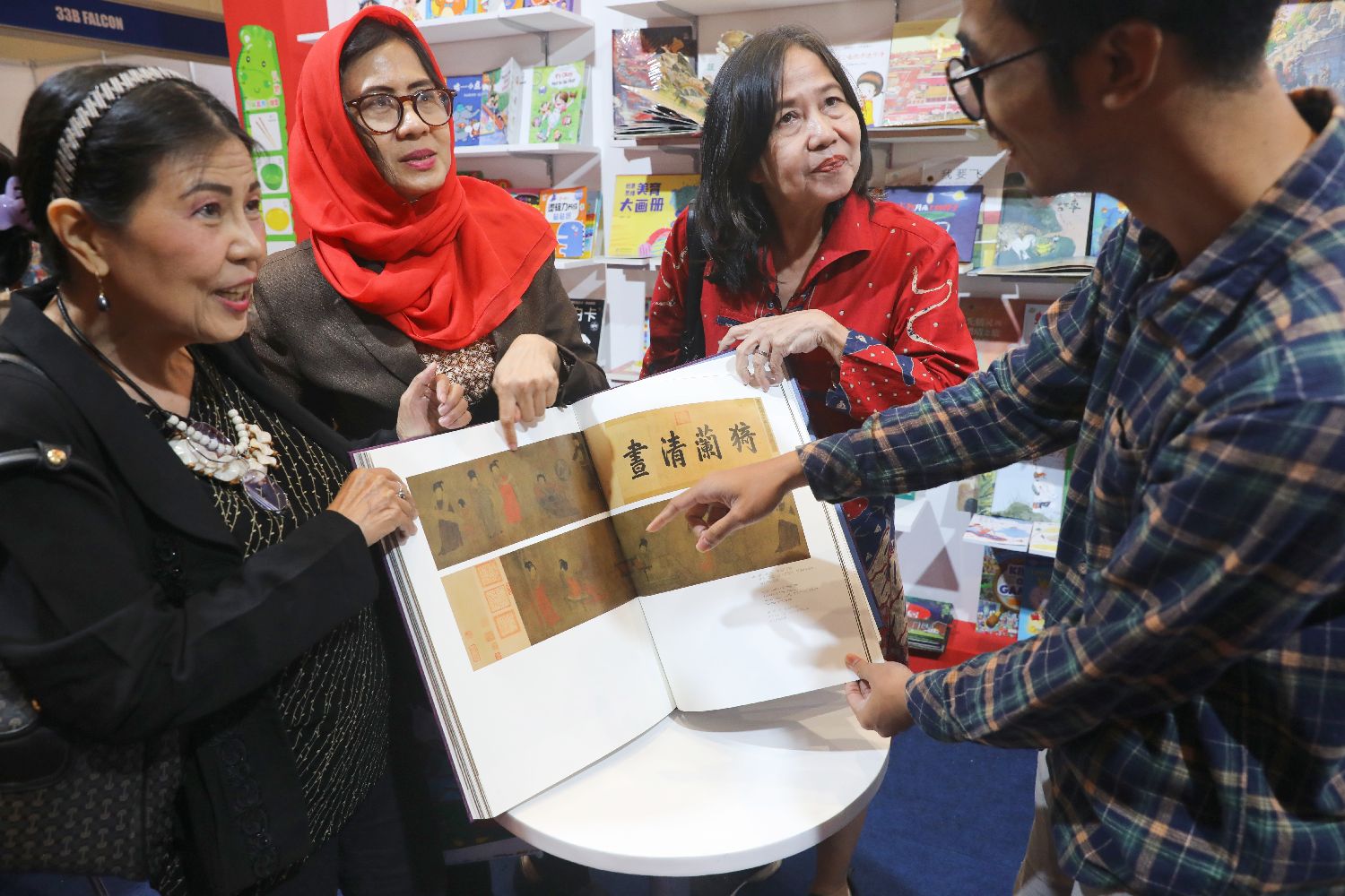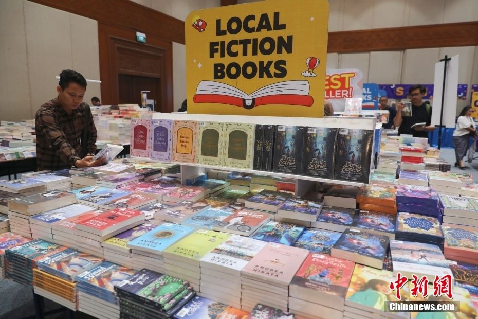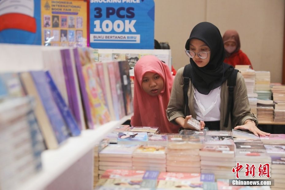 当地时间9月25日,为期5天的第四十四届(2024年)印度尼西亚国际书展在雅加达开幕。中国出版机构组团参展,共展出400余种、700余册中国精品图书,吸引众多观众探知中国文化的内涵。图为中国图书吸引印尼读者。中新社