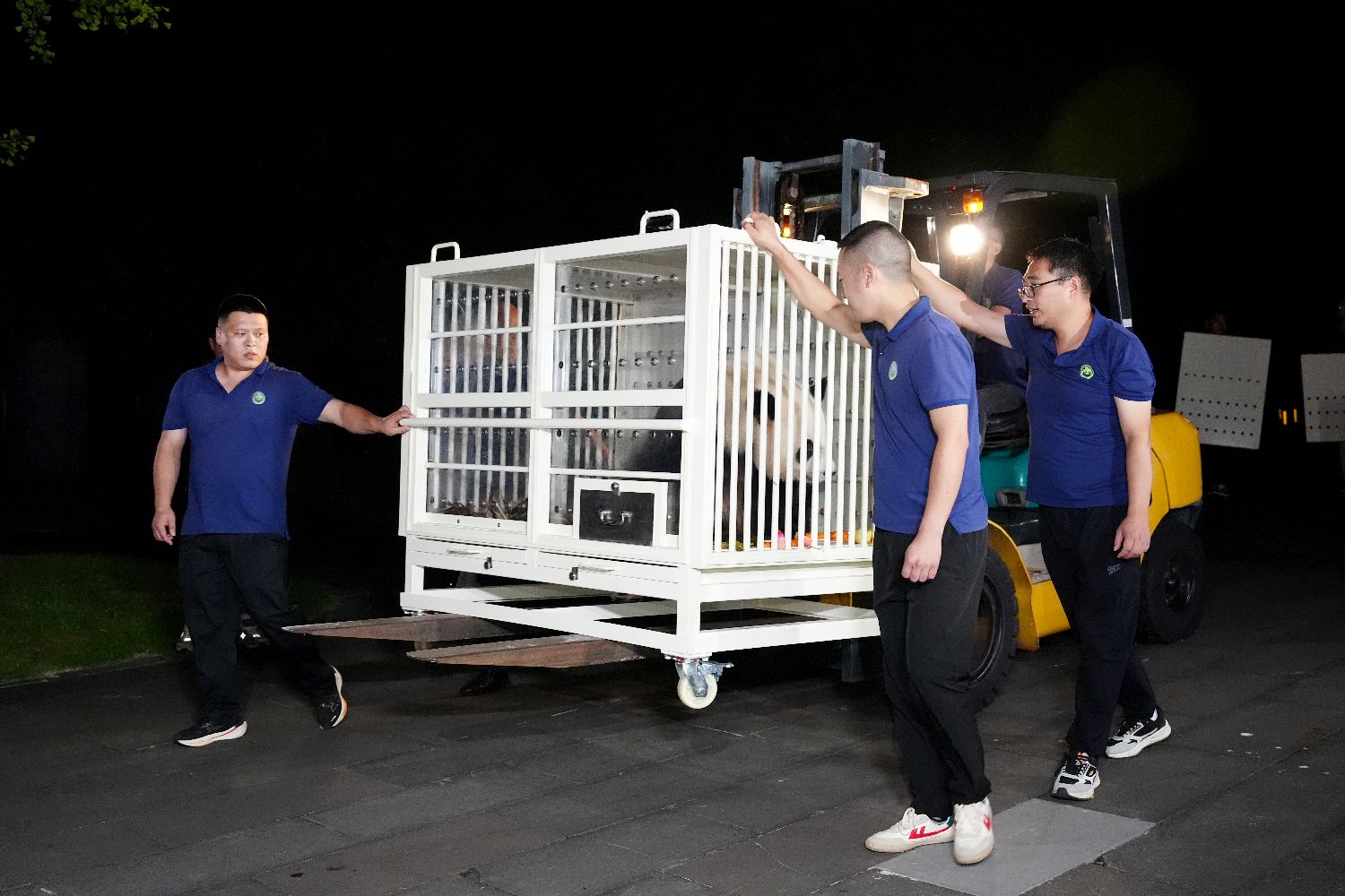 9月26日凌晨3时03分,大熊猫“安安”“可可”从中国大熊猫保护研究中心都江堰基地出发,正式启程前往香港,定居香港海洋公园。图为工作人员将大熊猫“可可”转运至运输车上。中新社