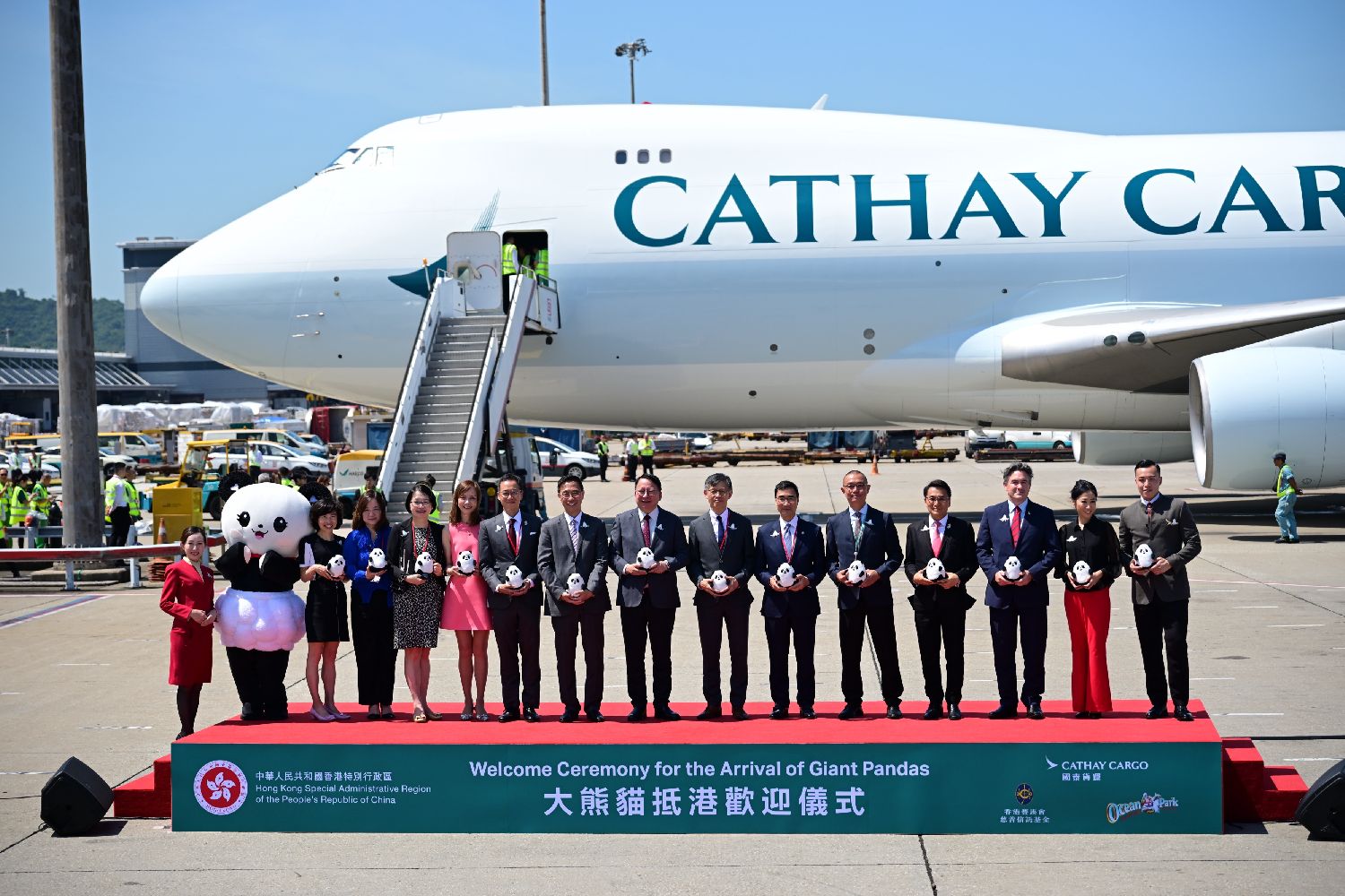 9月26日,在香港国际机场,嘉宾在欢迎仪式现场合影。新华社