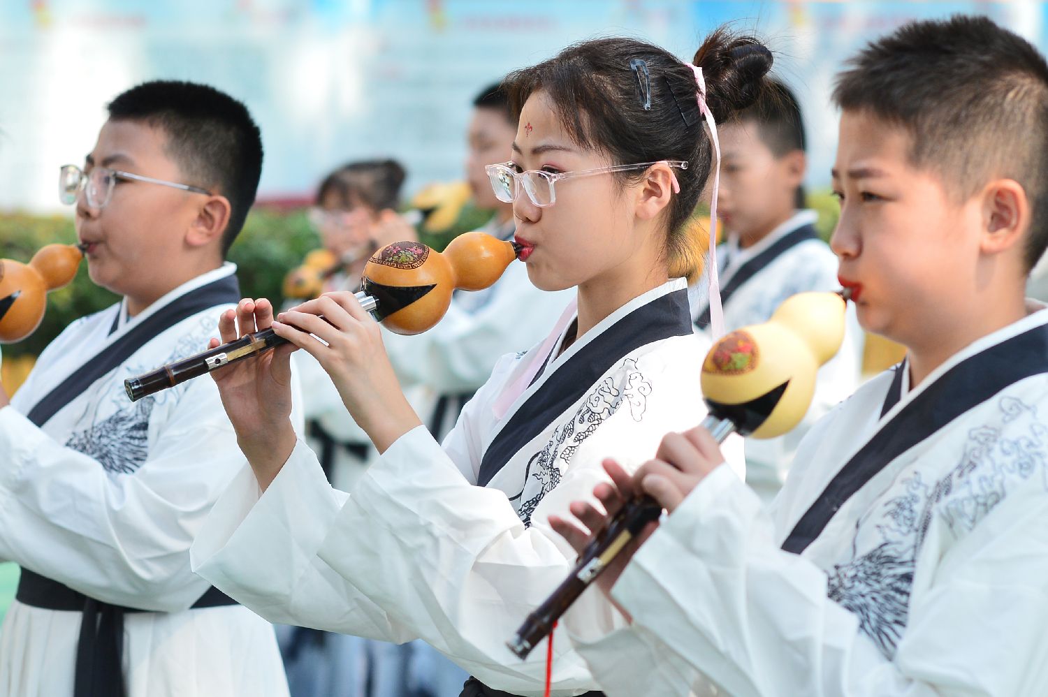 中国国庆节临近,多地举办形式多样的国庆主题趣味活动,欢乐迎国庆。图为9月26日,在山东青岛陵县路小学开展的国庆主题活动上,小学生在表演葫芦丝。